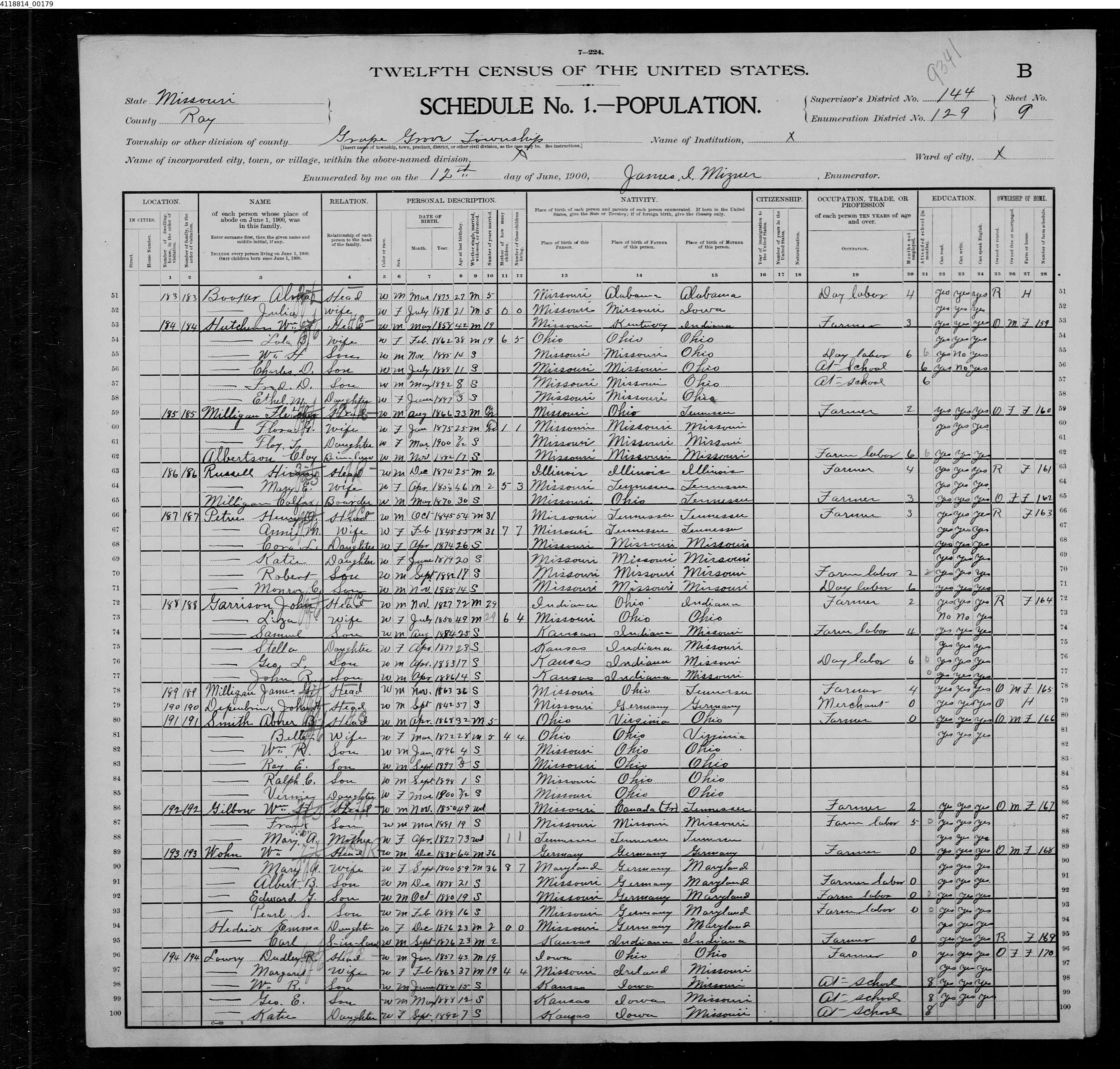 8176. “United States Census,” 1900, MO, Ray, Grape Grove, 9B, 144, 129, T623, 1240885, 179, Bureau of the Census, US Dept. of Commerce, United States of America, June 12, 1900, James I Mizner.