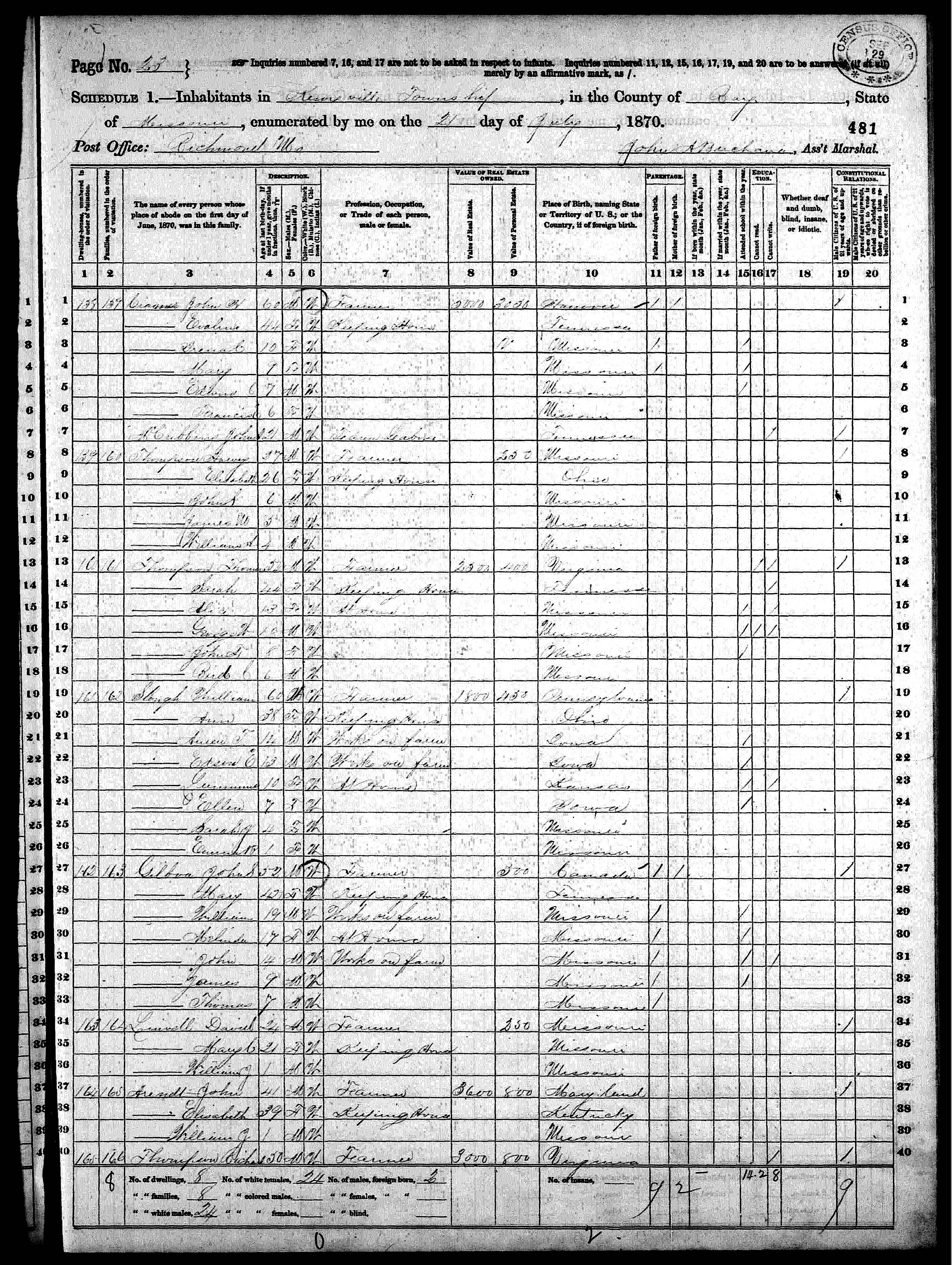 8177. “United States Census,” 1870, MO, Ray, Knoxville, Richmond, 23, M593, 482, 273, Bureau of the Census, US Dept. of Commerce, United States of America, June 21, 1870, John A Buchana.