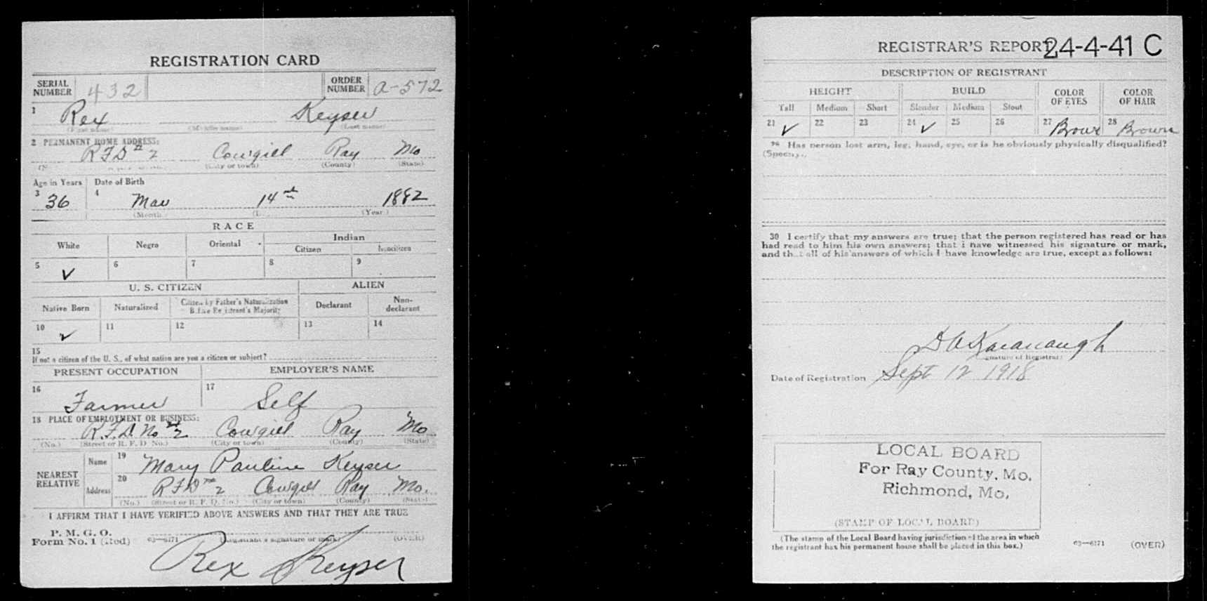 8254. World War I, 1918, Idaho, 432, Keyser, Rex, “World War I Selective Service System Draft Registration Cards,” September 12, 1918, Ray County, MO, https://familysearch.org/ark:/61903/1:1:K3RP-W93.