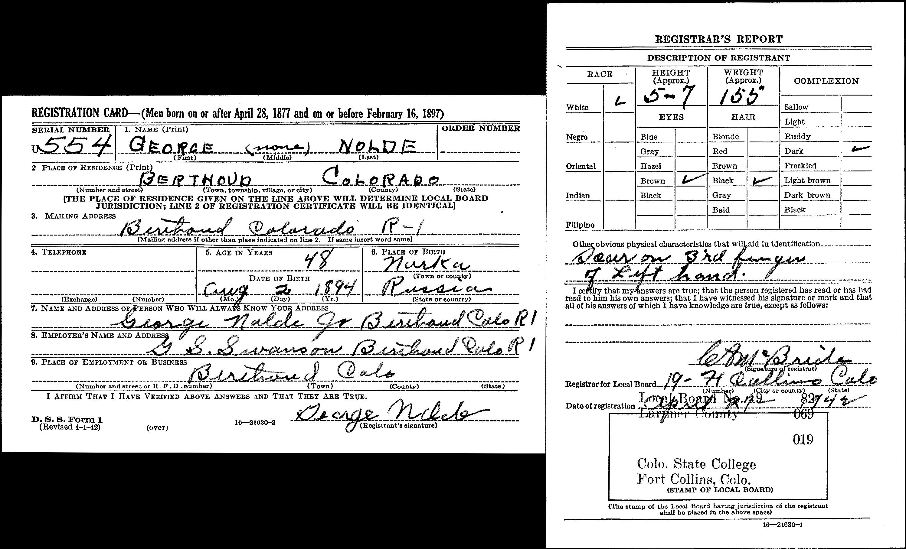 8271. World War II, 1942, Colorado, U554, Nolde, George (no middle name), “World War II Draft Cards (4th Registration) for the State of Colorado,” April 27, 1942, Colorado State College, Fort Collins, CO, https://familysearch.org/ark:/61903/1:1:QKC4-H63G.