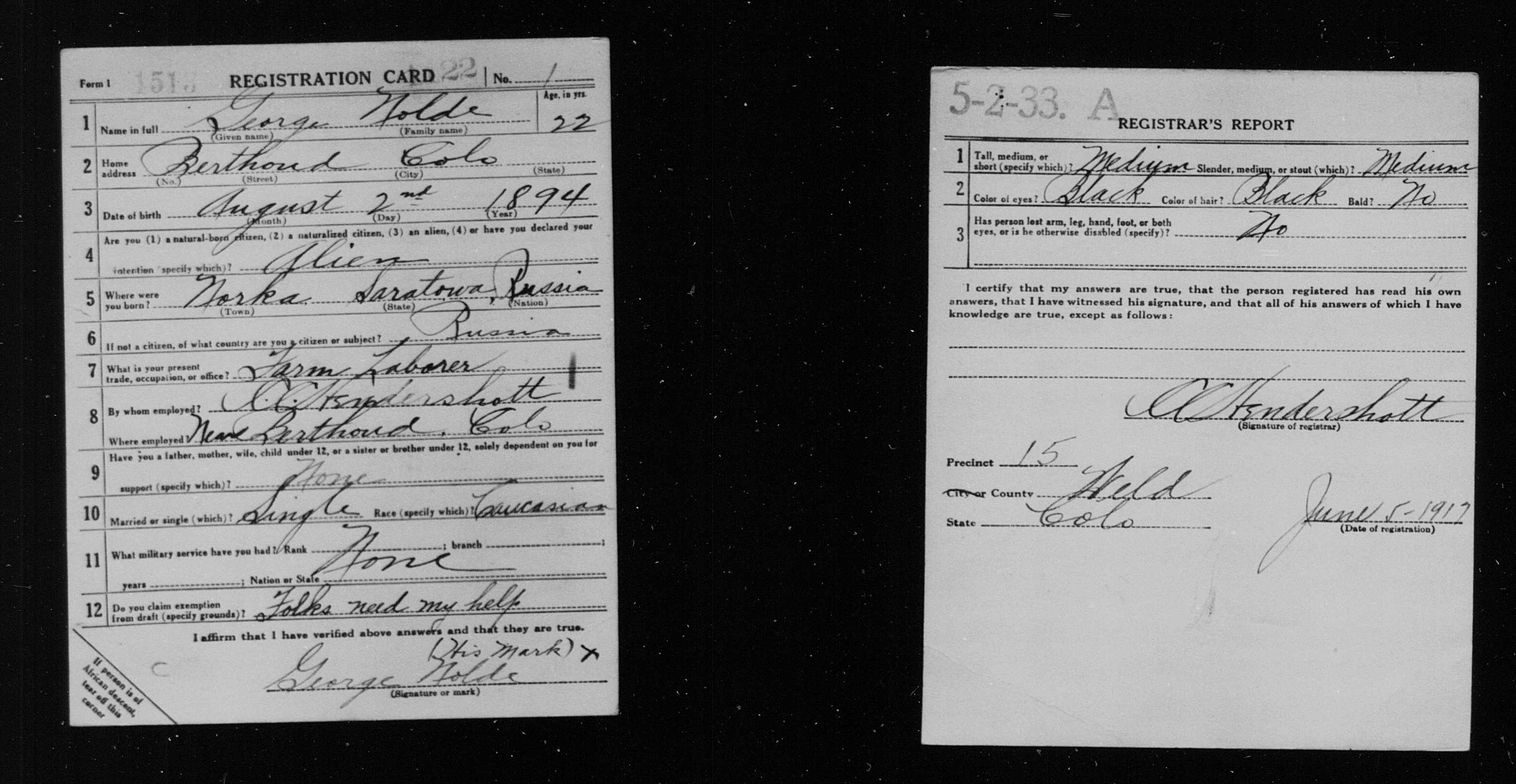 8272. World War I, 1917, Colorado, 1513, Nolde, George, “World War I Selective Service System Draft Registration Cards,” June 5, 1917, Precinct 15, Weld County, CO, https://familysearch.org/ark:/61903/1:1:KZK6-VF2.