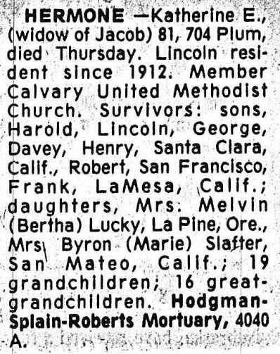 HERMONE—Katherine E., (widow of Jacob) 81, 704 Plum, died Thursday. Lincoln resident since 1912. Member Calvary United Methodist Church. Survivors: sons, Harold, Lincoln, george, Davey, Henry, Santa Clara, Calif., Robert, San Francisco, Frank, LaMesa, Calif.; daughters, Mrs. Mrs. Melvin (Bertha) Lucky, La Pine, Ore., Mrs. Byron (Marie) Slafter, San Mateo, Calif.; 10 grandchildren; 16 great-grandchildren. Hodgman-Splain-Proberts Mortuary, 4040 A.