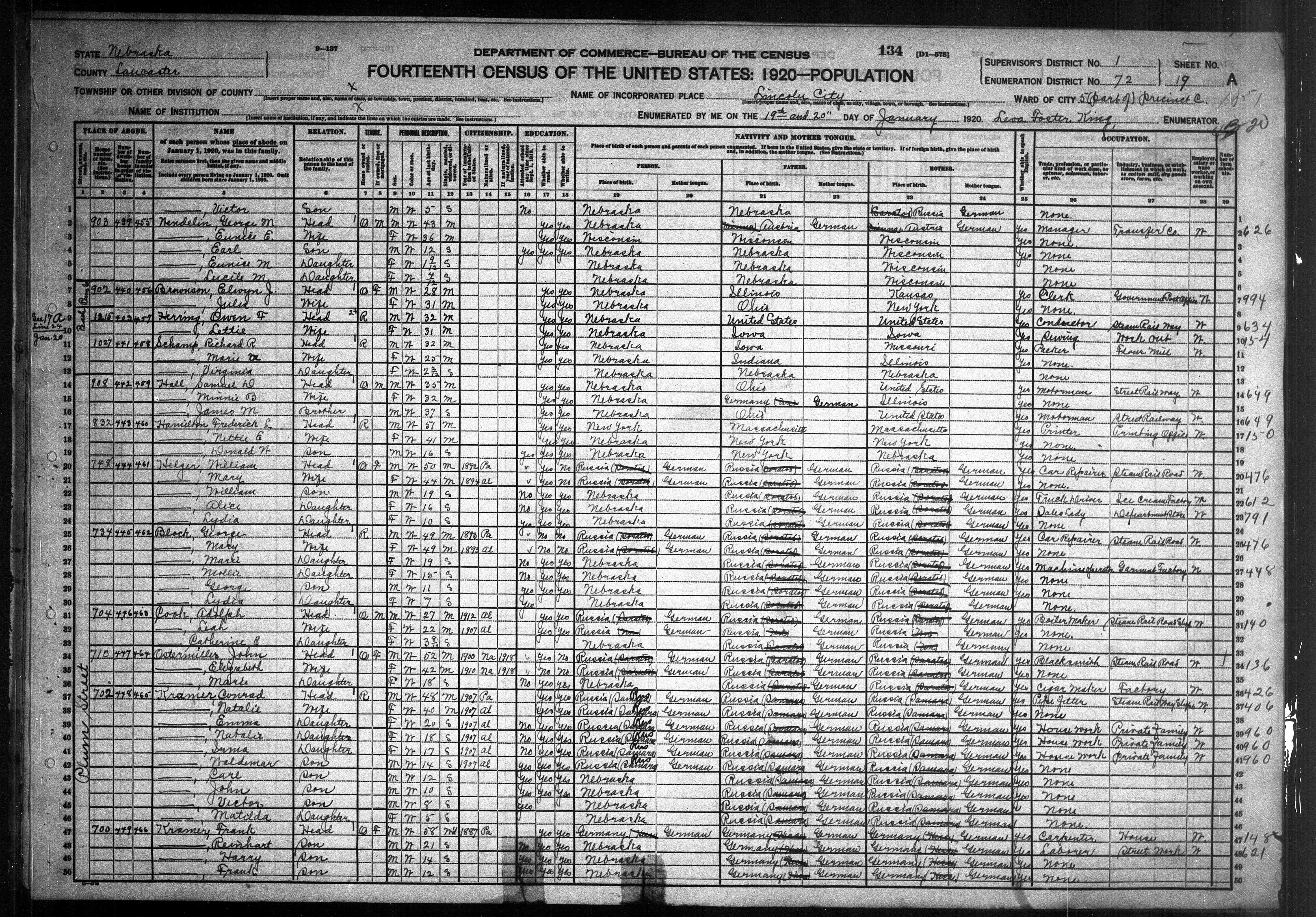8316. “United States Census,” 1920, NE, Lancaster, Lincoln, Ward 5, Precinct C, 19A, 1, 72, T625, 996, 844, Bureau of the Census, US Dept. of Commerce, United States of America, January 20, 1920, Leva Foster King.
