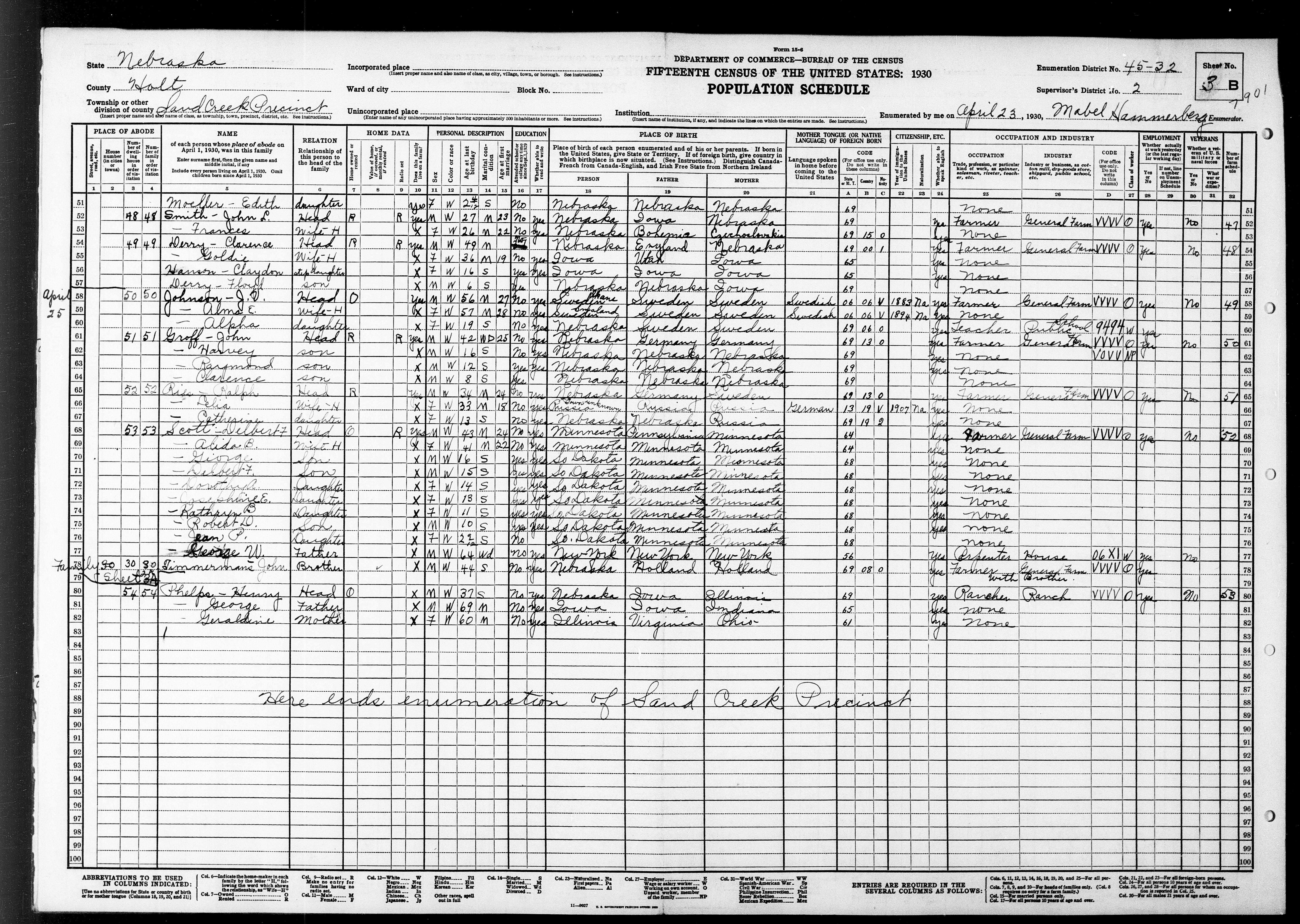 8317. “United States Census,” 1930, NE, Holt, Sand Creek, 3B, 2, 45-22, T626, 1285, 442, Bureau of the Census, US Dept. of Commerce, United States of America, April 23, 1930, Mabel Hammerberg.