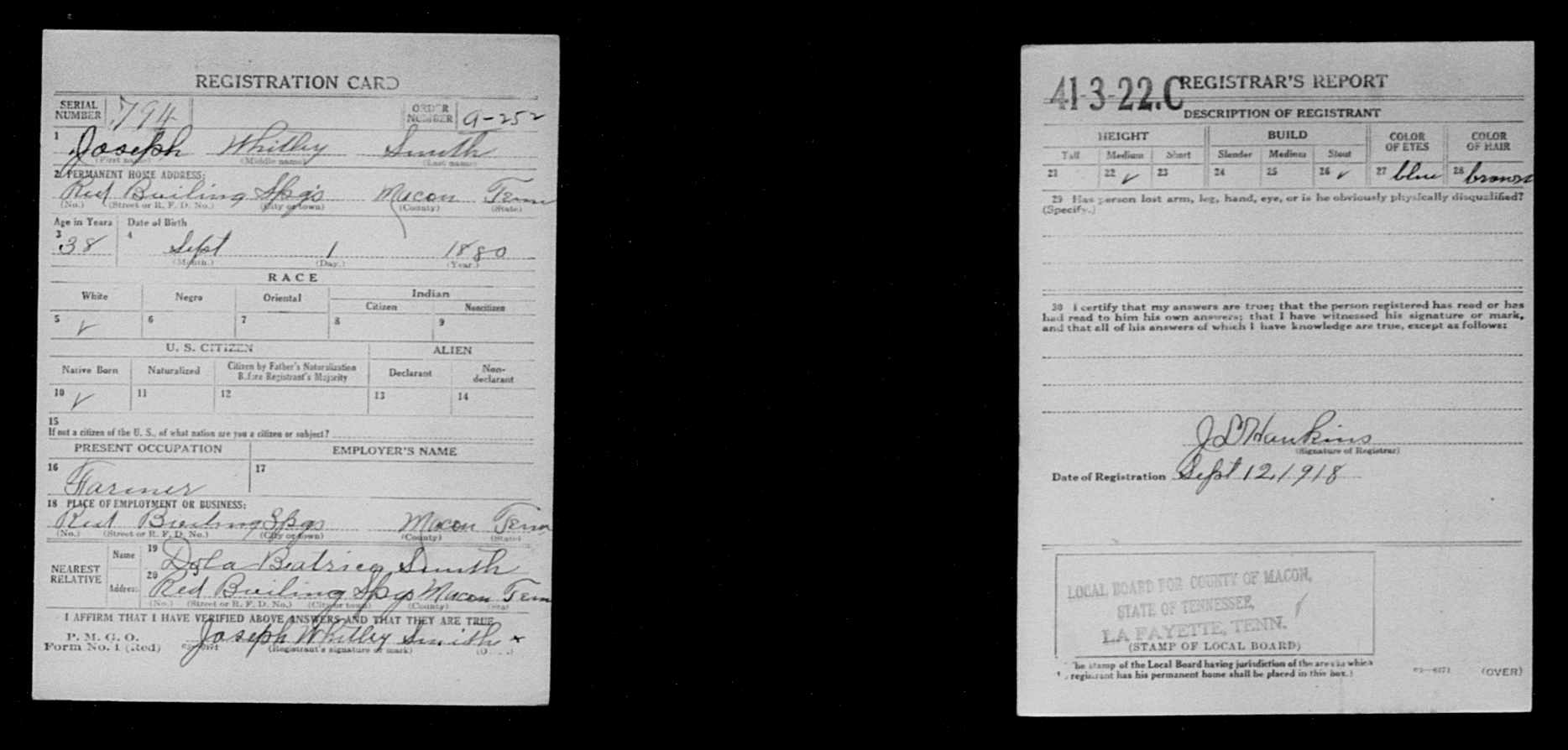 8334. World War I, 1918, TN, 794, Smith, Joseph Whitley, “World War I Selective Service System Draft Registration Cards,” September 12, 1918, Macon County, TN, GS Film Number 1877380-Digital Folder Number 005152435-Image Number 02148, https://familysearch.org/ark:/61903/1:1:KZ6J-RKZ.