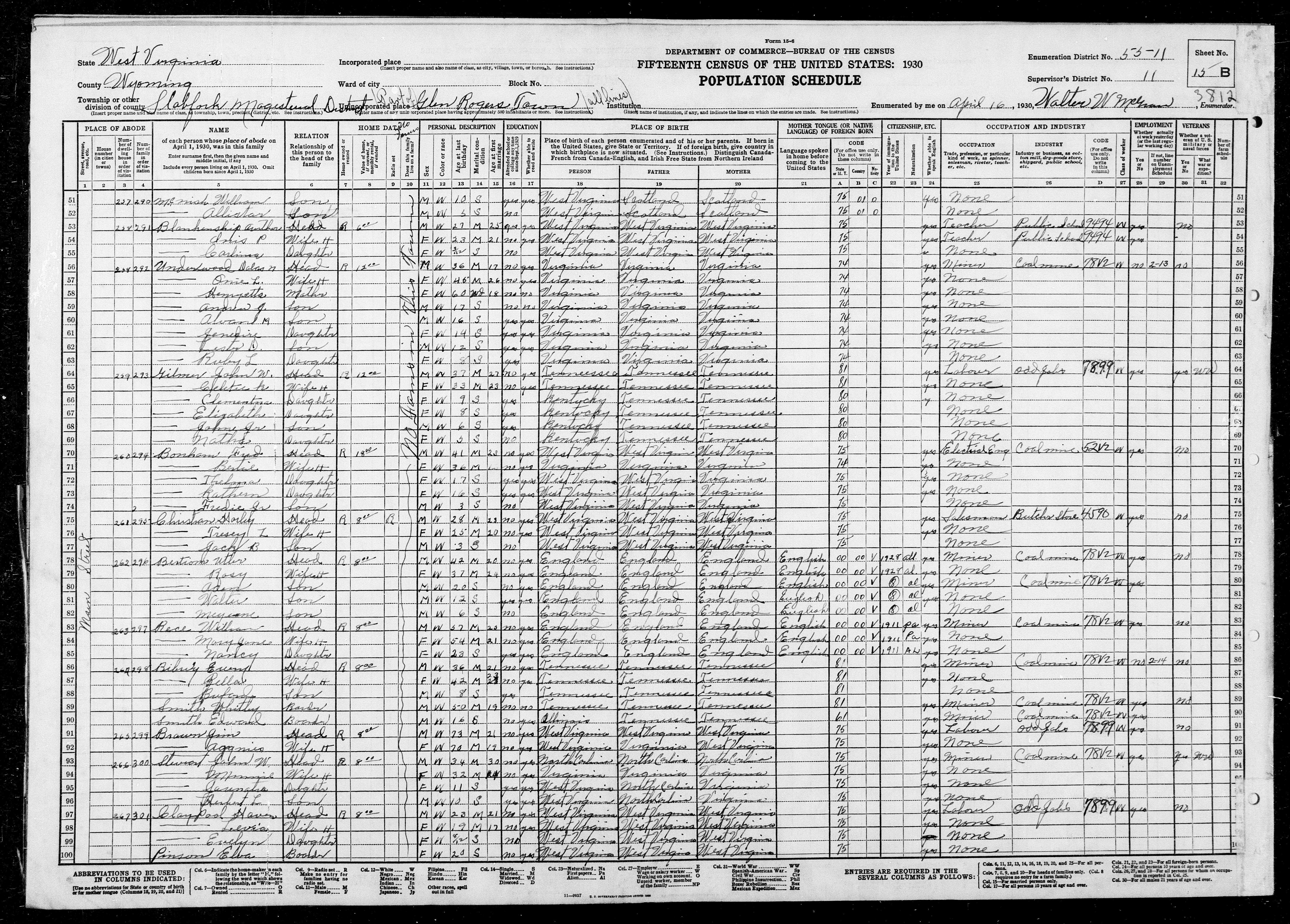 8337. “United States Census,” 1930, WV, Wyoming, Slab Fork, Glen Rogers Town, 15B, 11, 55-11, T626, 2559, 492, Bureau of the Census, US Dept. of Commerce, United States of America, April 16, 1930, Walter W McGraw.
