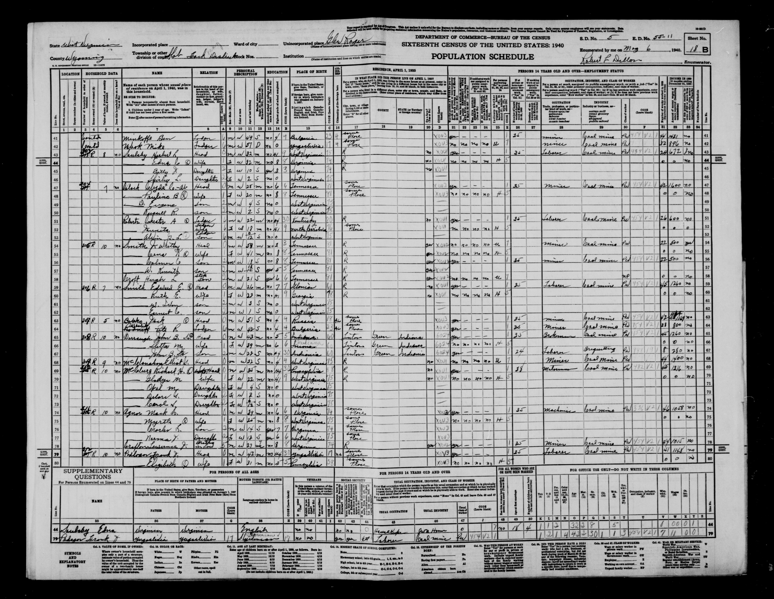 8338. “United States Census,” 1940, WV, Wyoming, Slab Fork, Glen Rogers, 18B, 51940 , 55-11, T627, 592, Bureau of the Census, US Dept. of Commerce, United States of America, May 6, 1940, Robert L Dillon.