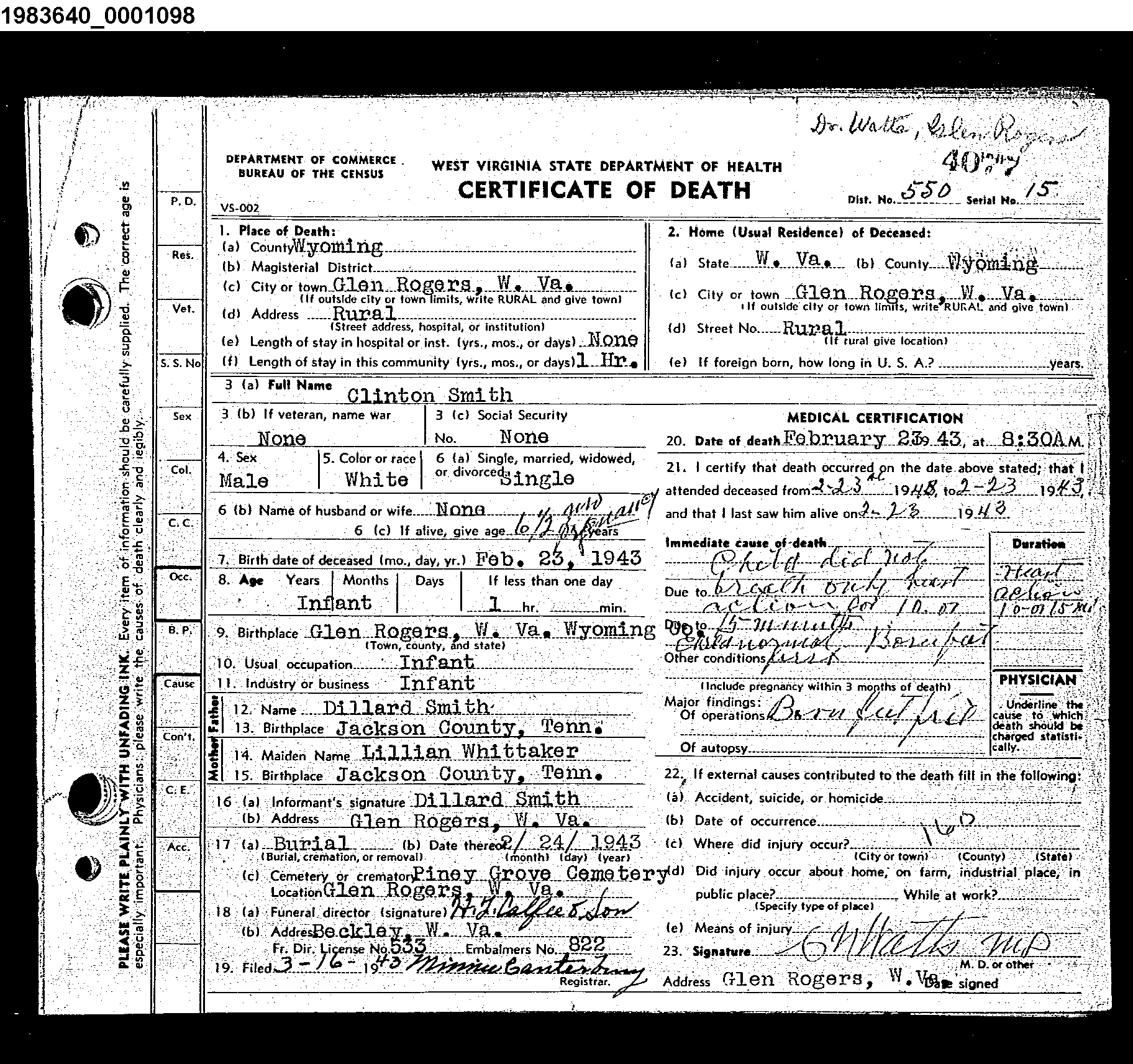 8342. Clinton Smith, “West Virginia Deaths, 1804-1999,” February 23, 1943, Glen Rogers, Wyoming County, WV, https://familysearch.org/ark:/61903/1:1:NM5M-RB7.