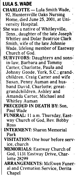 8344. “Obituaries,” Lula S. Wade, Gaston Gazette, Gaston, North Carolina, June 27, 2001, 4B.