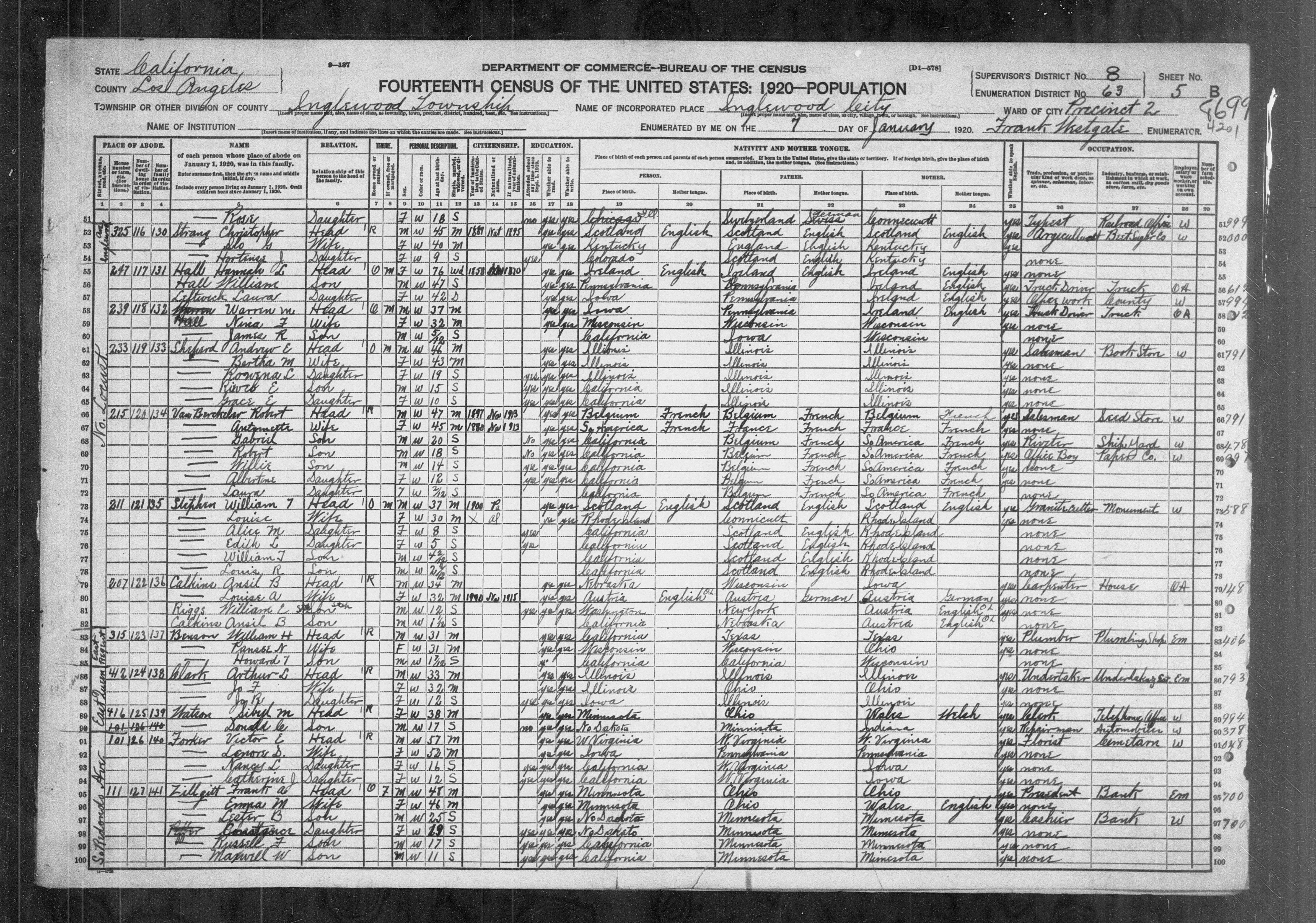 8466. “United States Census,” 1920, CA, Los Angeles, Inglewood, 5B, 8, 14963, T625, 103, 678, Bureau of the Census, US Dept. of Commerce, United States of America, January 7, 1920, Frank Westgate.