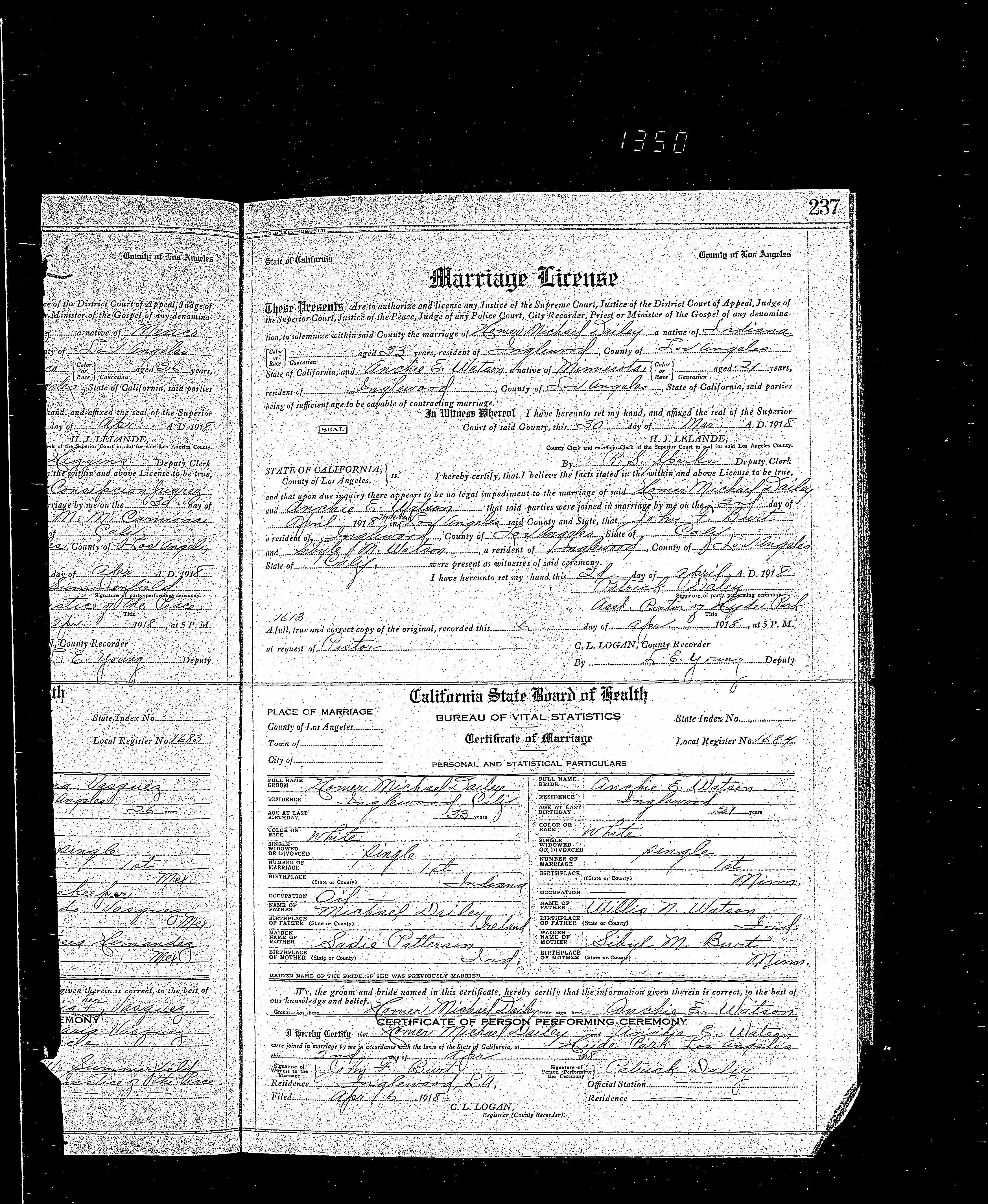 8468. Homer Michael Dailey and Anchie E Watson, “California, County Marriages, 1850-1952,” April 2, 1918, Los Angeles County, CA, https://familysearch.org/ark:/61903/1:1:XLCQ-9JD.