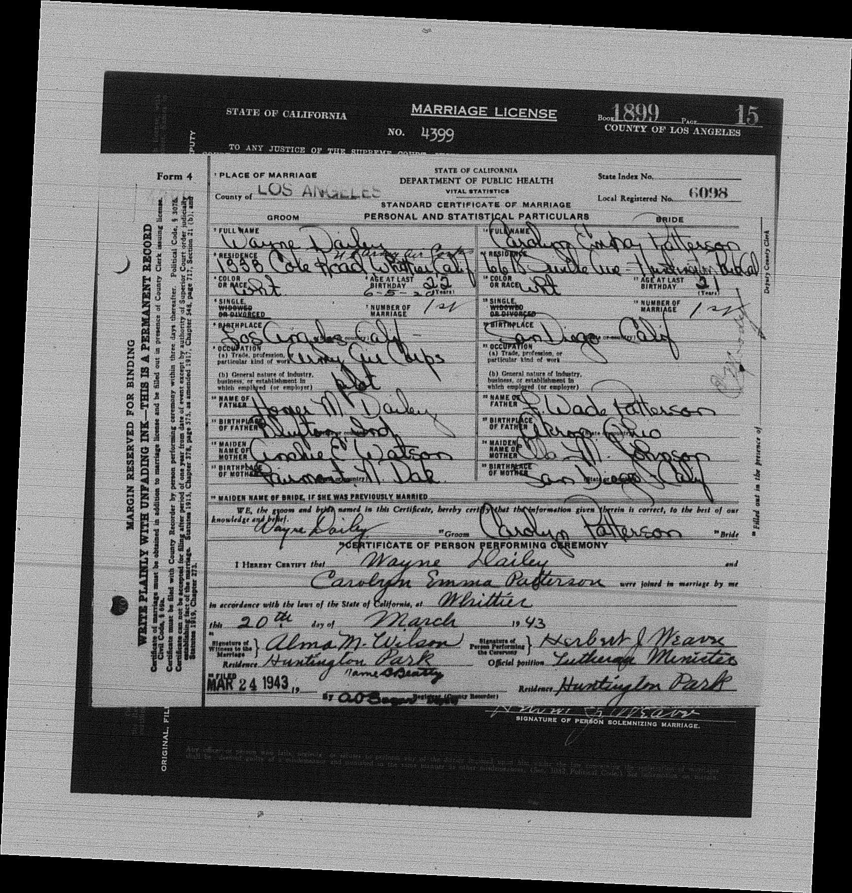 8470. Wayne Dailey and Carolyn Emma Patterson, “California, County Marriages, 1850-1952,” March 20, 1943, Whittier, Los Angeles County, CA, https://familysearch.org/ark:/61903/1:1:K826-PT7.