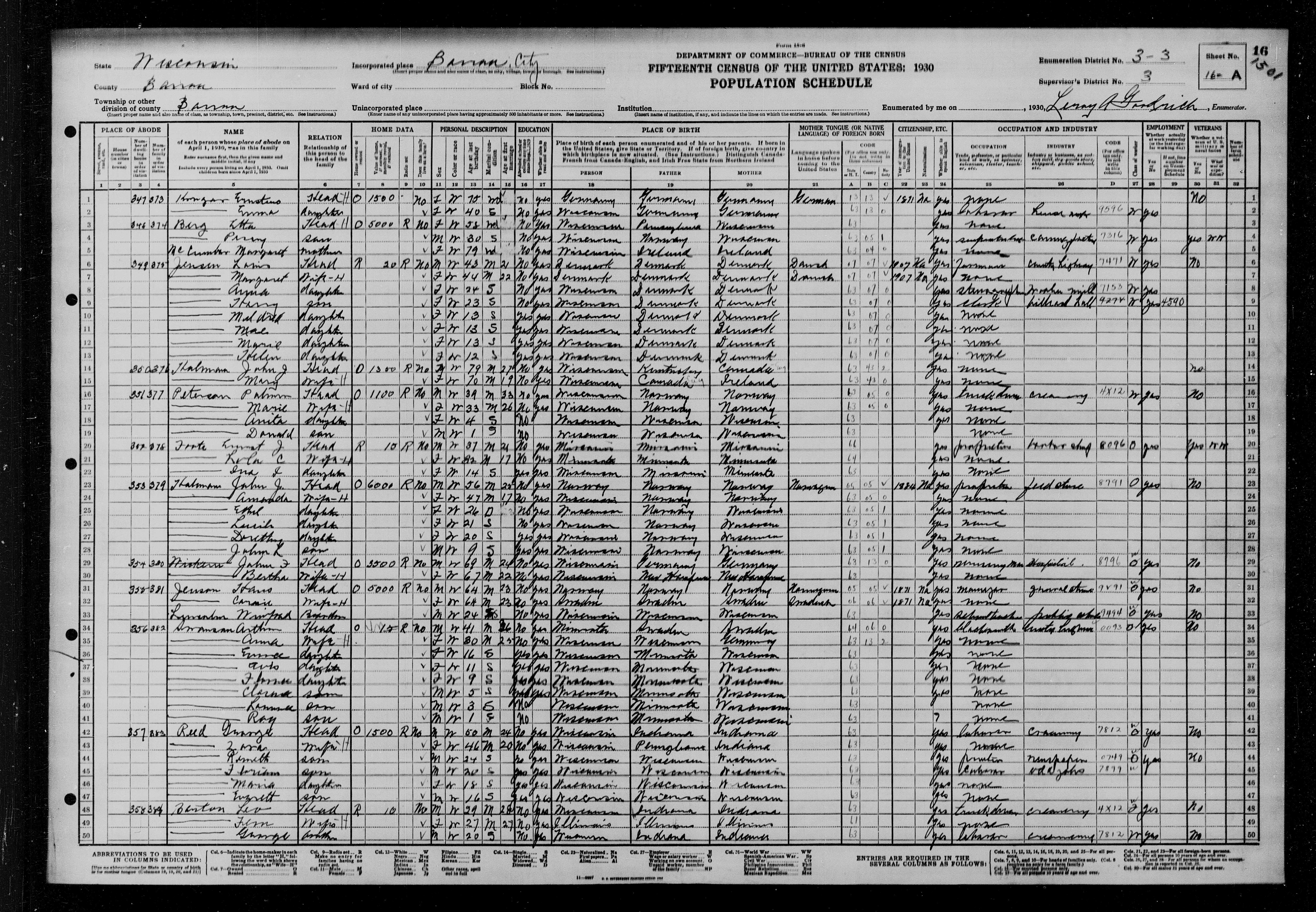 8478. “United States Census,” 1930, WI, Barron County, Barron, 16A, 3, 3-3, T626, 2561, 1501, 37, Bureau of the Census, US Dept. of Commerce, United States of America, Leroy A Goodrich.