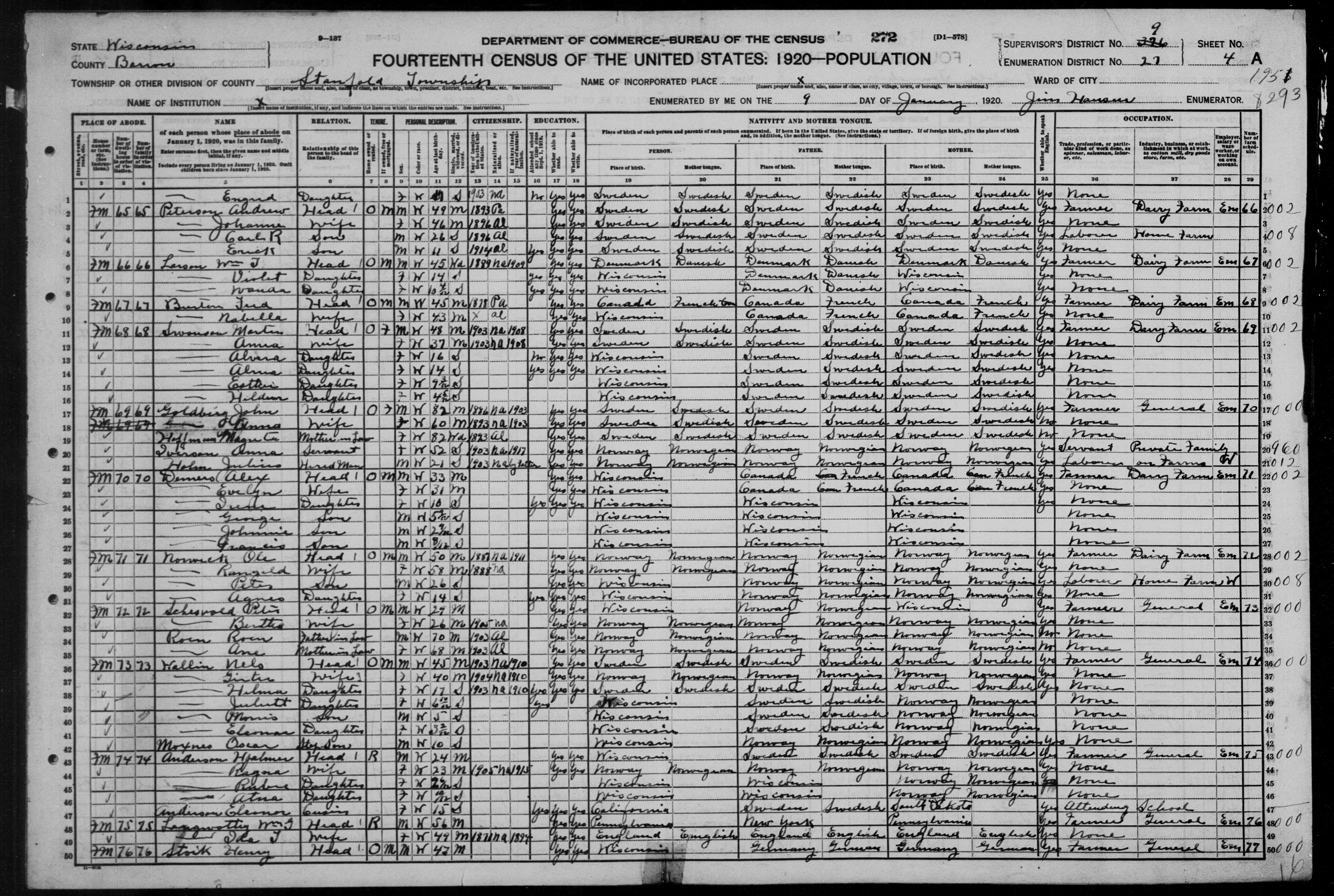 8481. “United States Census,” 1920, WI, Barron County, Stanford, 4A, 9, 27, T625, 1821976, 553, Bureau of the Census, US Dept. of Commerce, United States of America, January 9, 1920, Jim Hanson.