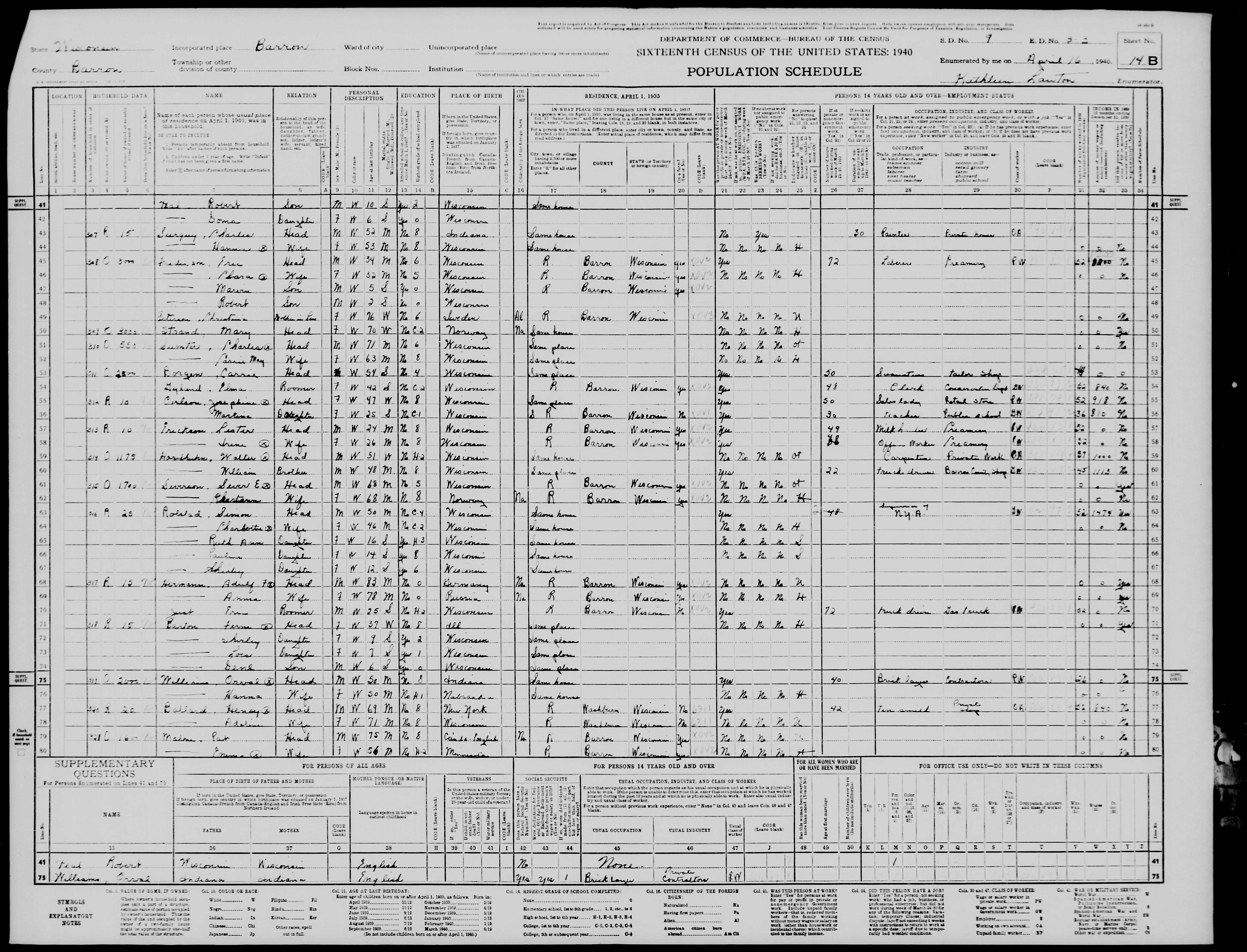 8482. “United States Census,” 1940, WI, Barron County, Barron, 14B, 9, 3-3, T627, 005461168, 92, Bureau of the Census, US Dept. of Commerce, United States of America, April 16, 1940, Kathleen Lawton.