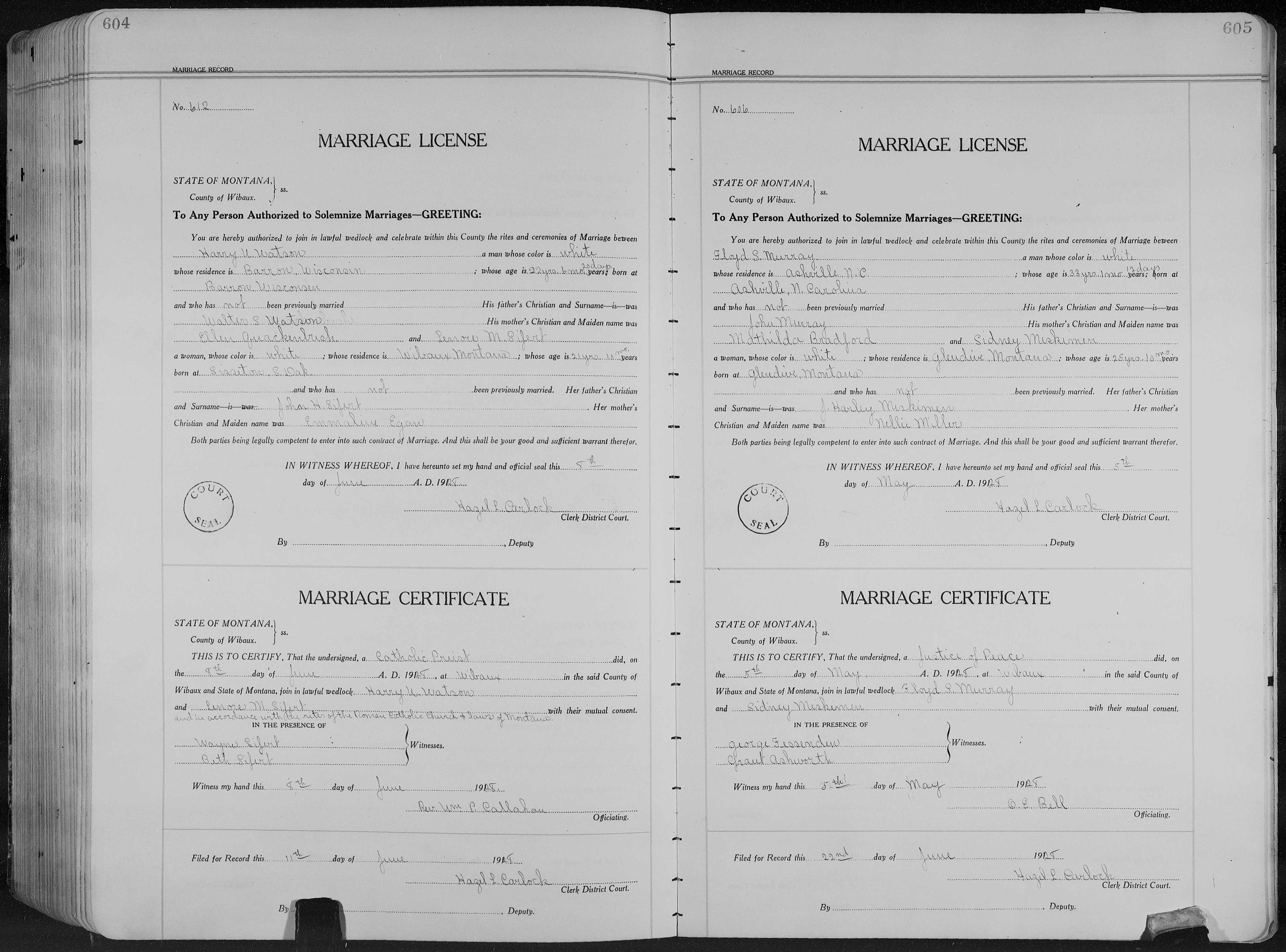 8492. Harry U Watson and Lenore M Sifert, “Montana, County Marriages, 1865-1950,” June 8, 1925, Wibaux, Wibaux County, MT, https://familysearch.org/ark:/61903/1:1:F37V-K8W.