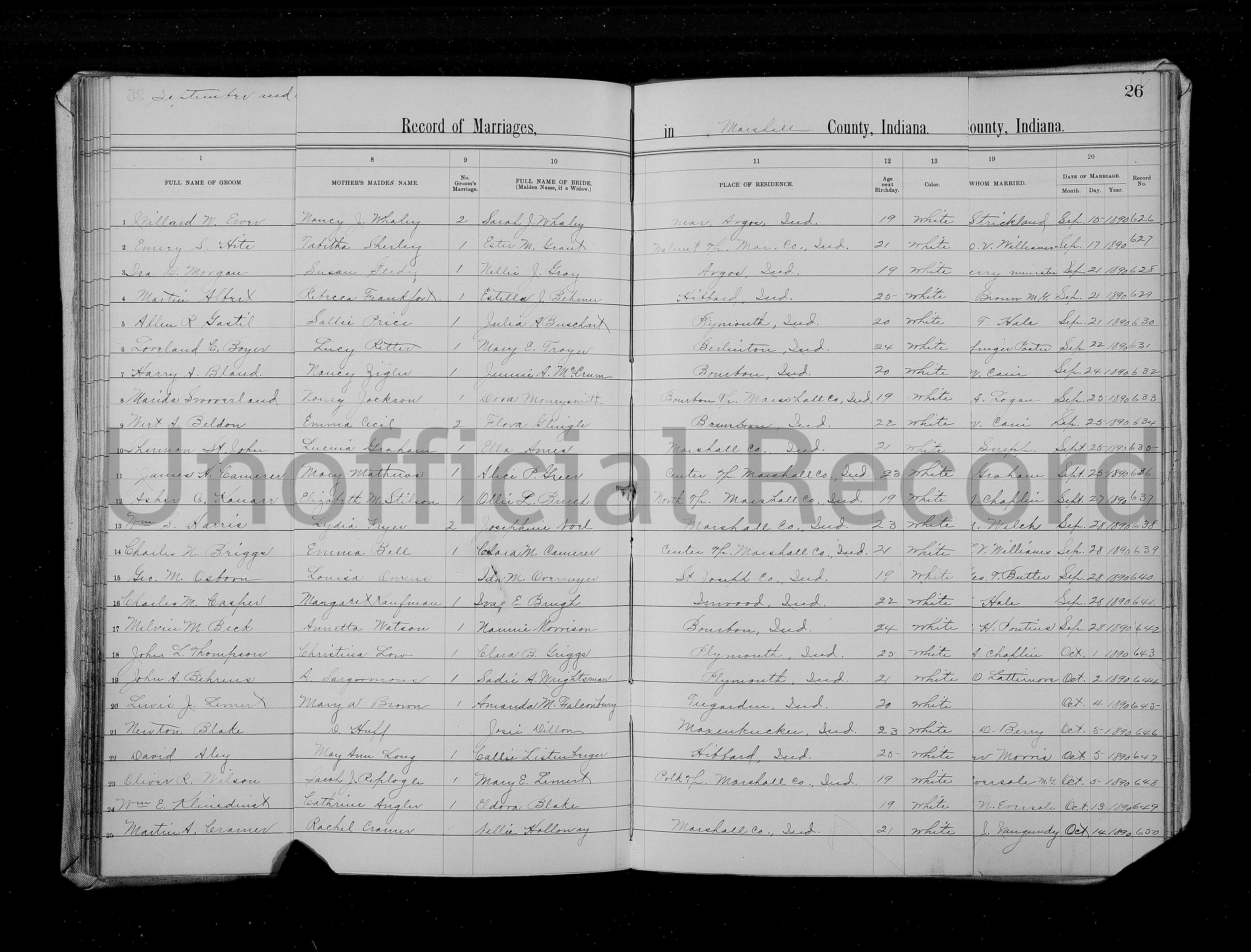 8558. Marion Harris and Sallie Stockman, “Indiana Marriages, 1811-2007,” January 1, 1888, Marshall County, IN, https://familysearch.org/ark:/61903/1:1:XXPK-9XD.