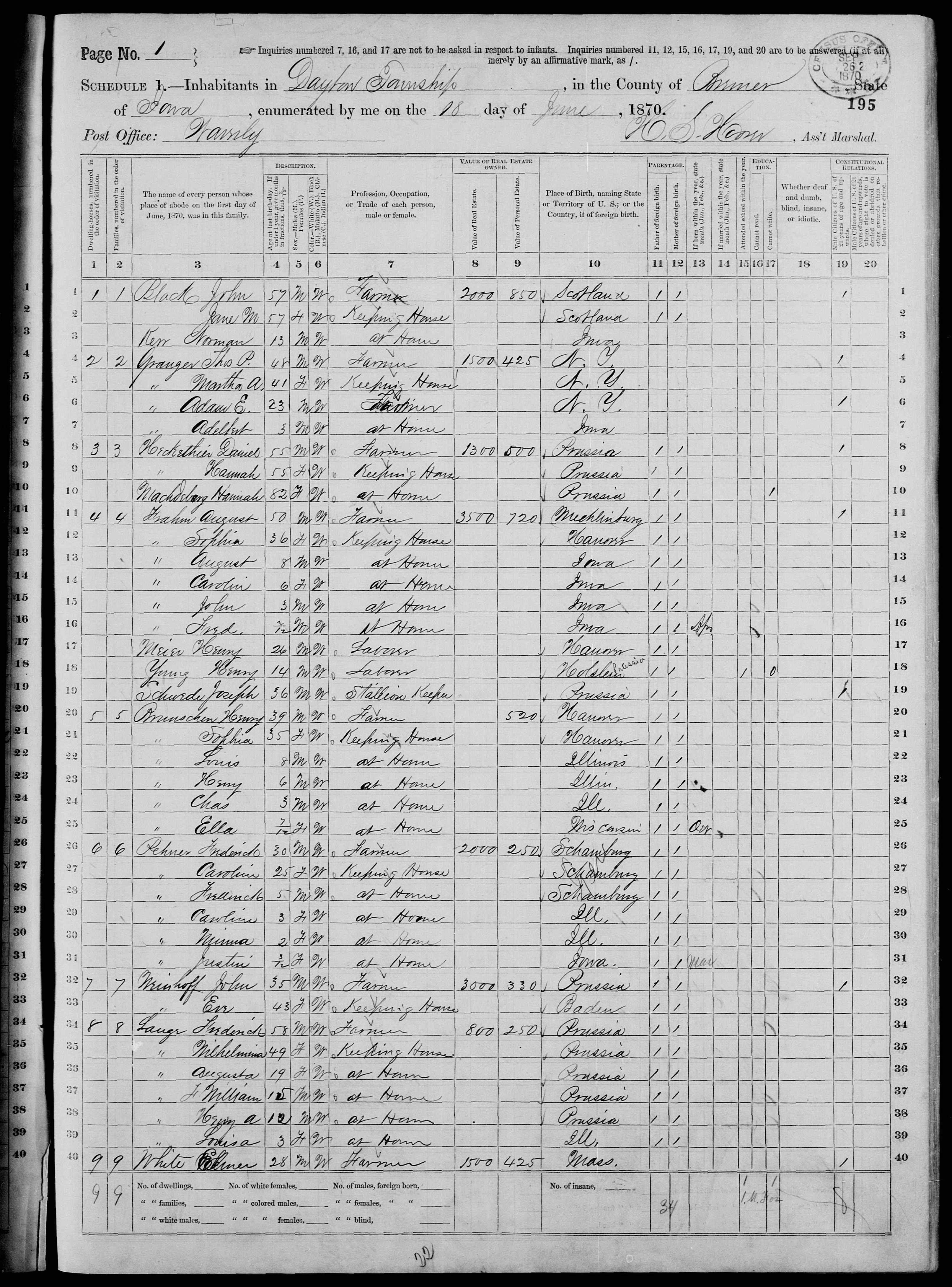 8599. “United States Census,” 1870, IA, Bremer, Dayton, Waverly, 1, M593, 395, Bureau of the Census, US Dept. of Commerce, United States of America, June 18, 1870, H S Heorn.