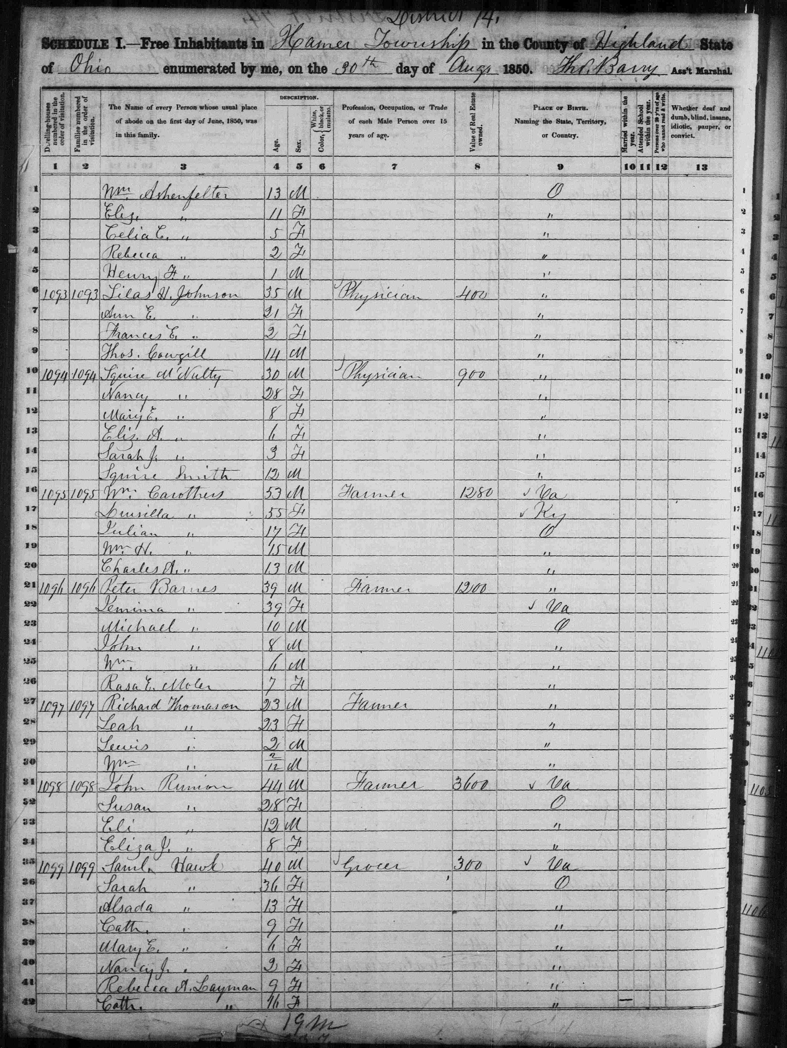 8696. “United States Census,” 1850, OH, Highland, Hamer, District 14, M432, 694, 489, Bureau of the Census, US Dept. of Commerce, United States of America, August 30, 1850, Ths. Barry.