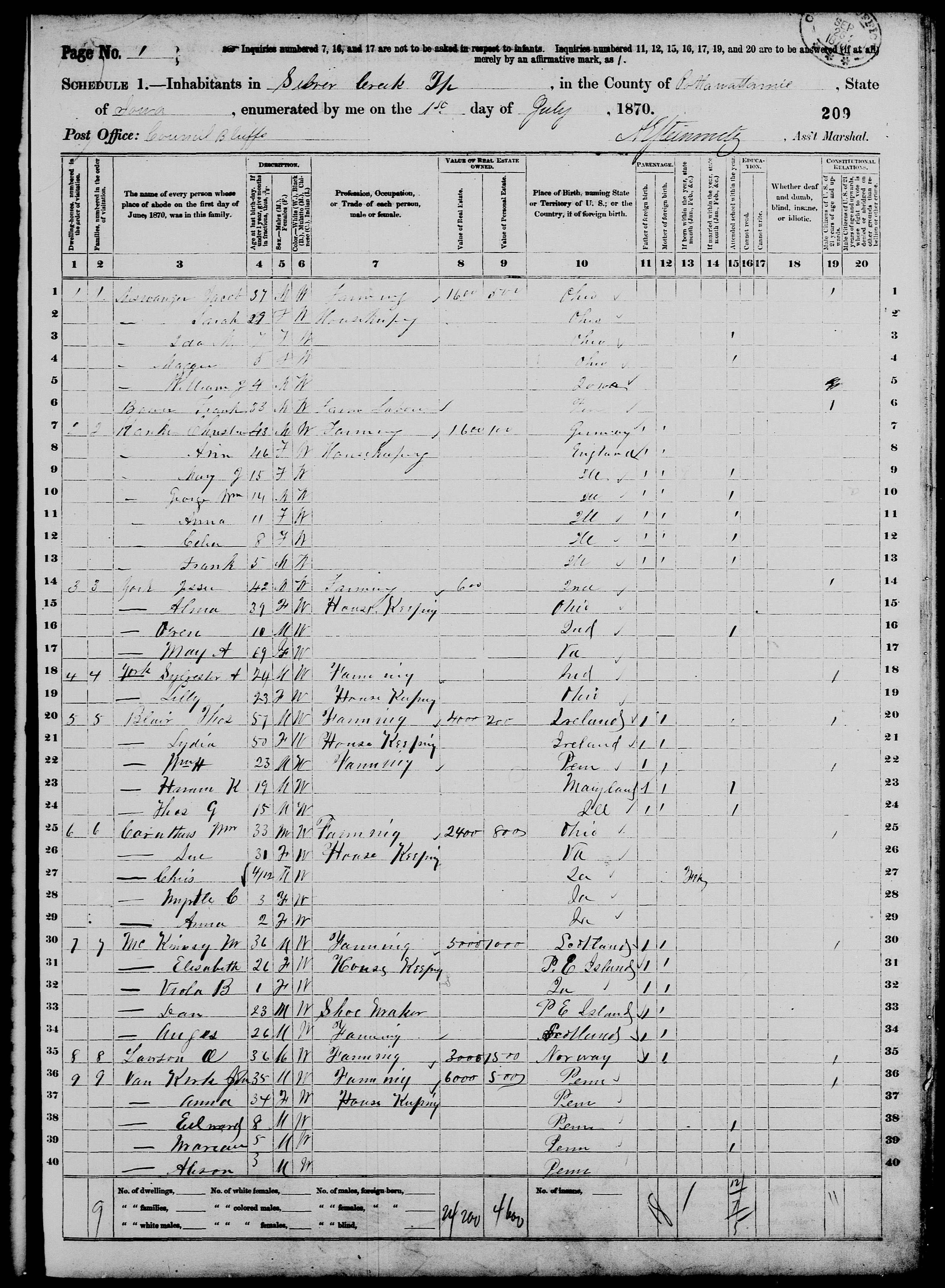 8698. “United States Census,” 1870, IA, Pottawattamie, Silver Creek, Council Bluffs, 1, M593, 545915, 209, 421, Bureau of the Census, US Dept. of Commerce, United States of America, July 1, 1870.