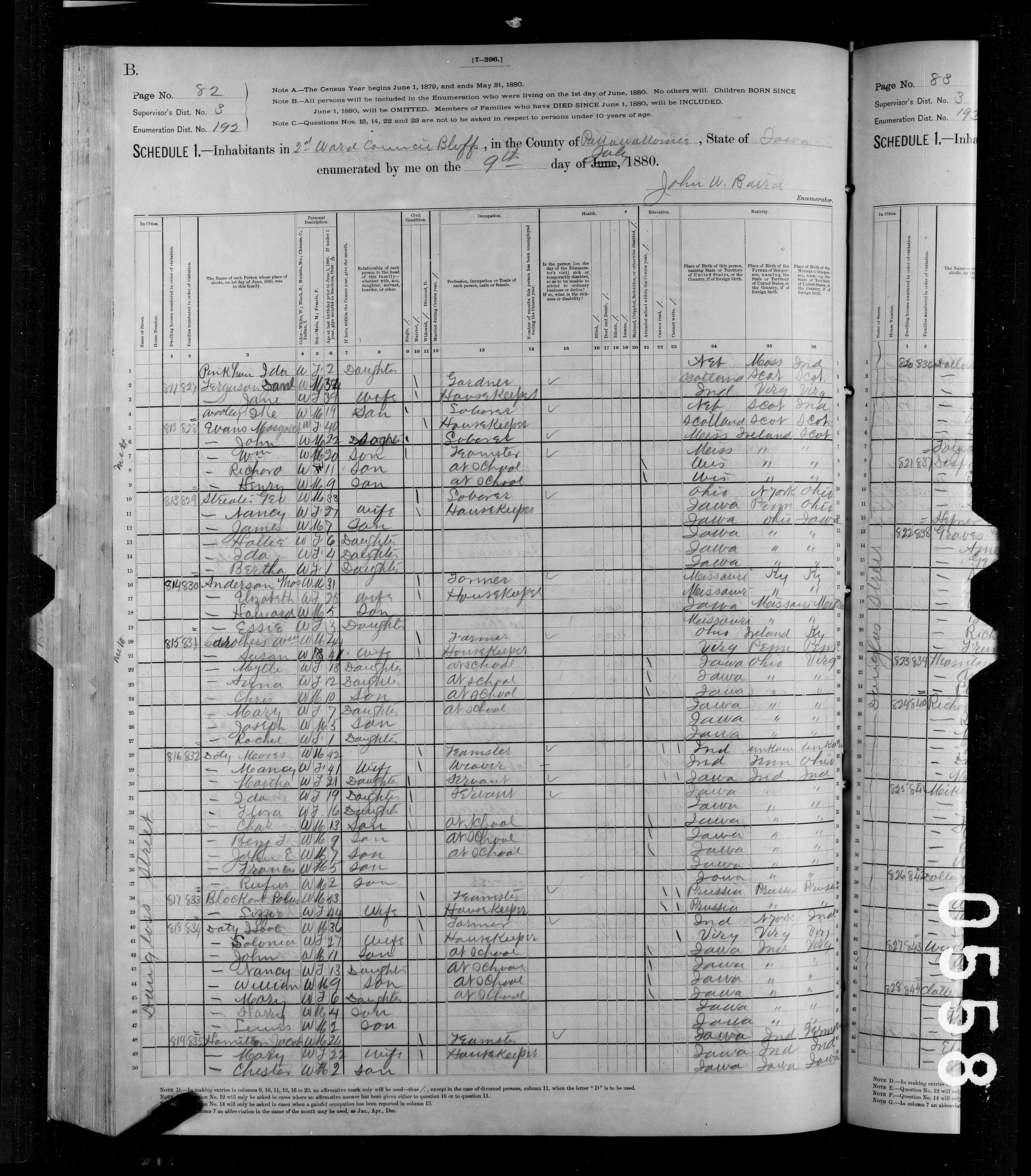 8699. “United States Census,” 1880, IA, Pottawattomie, Council Bluffs, Ward 02, 82B, 3, 192, T9, 0361, 575, Bureau of the Census, US Dept. of Commerce, United States of America, July 9, 1880, John W Baird.