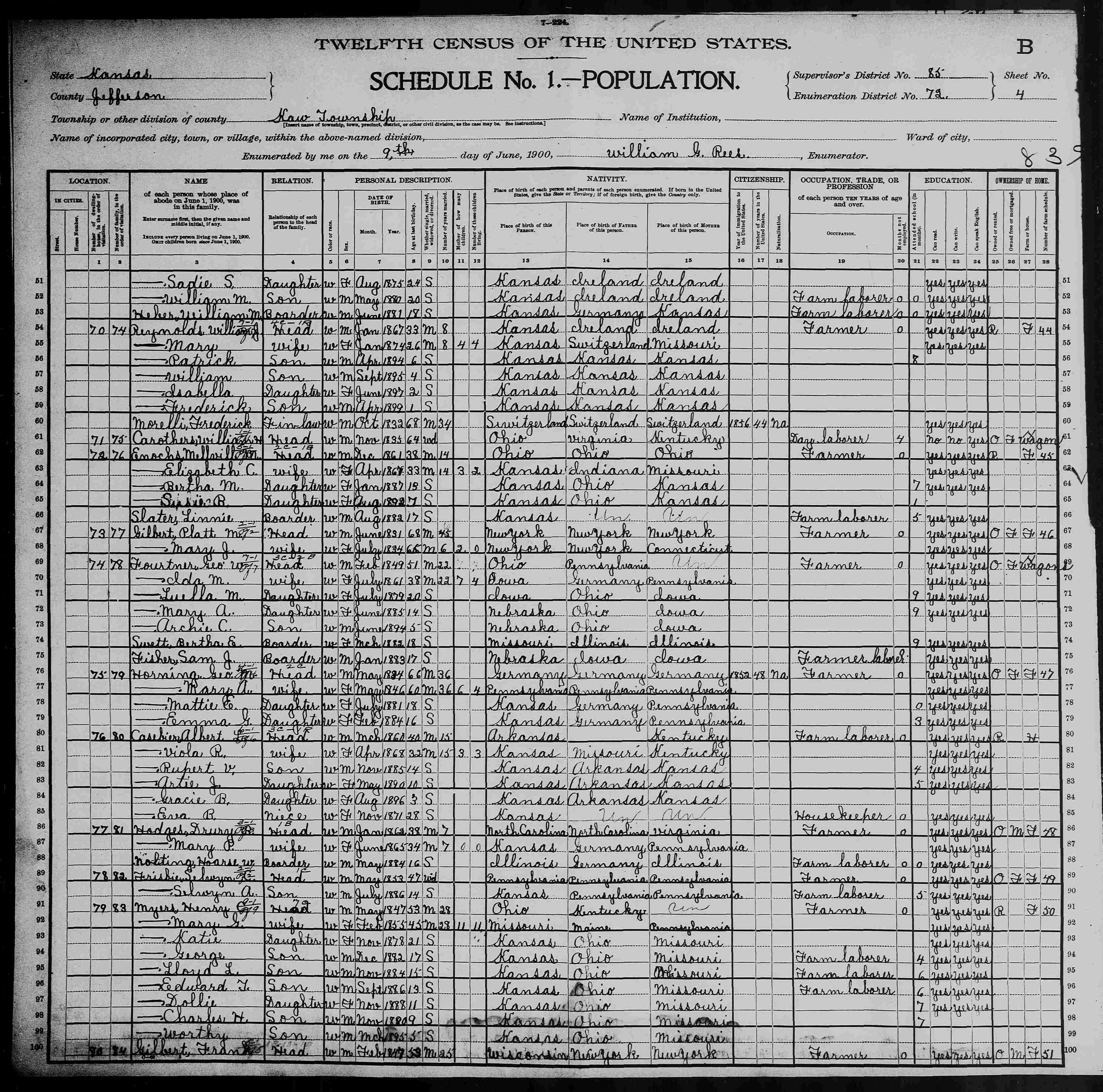 8700. “United States Census,” 1900, KS, Jefferson, Kaw, 4B, 85, 72, T623, 1240483, 523, Bureau of the Census, US Dept. of Commerce, United States of America, June 9, 1900, William G Rees.