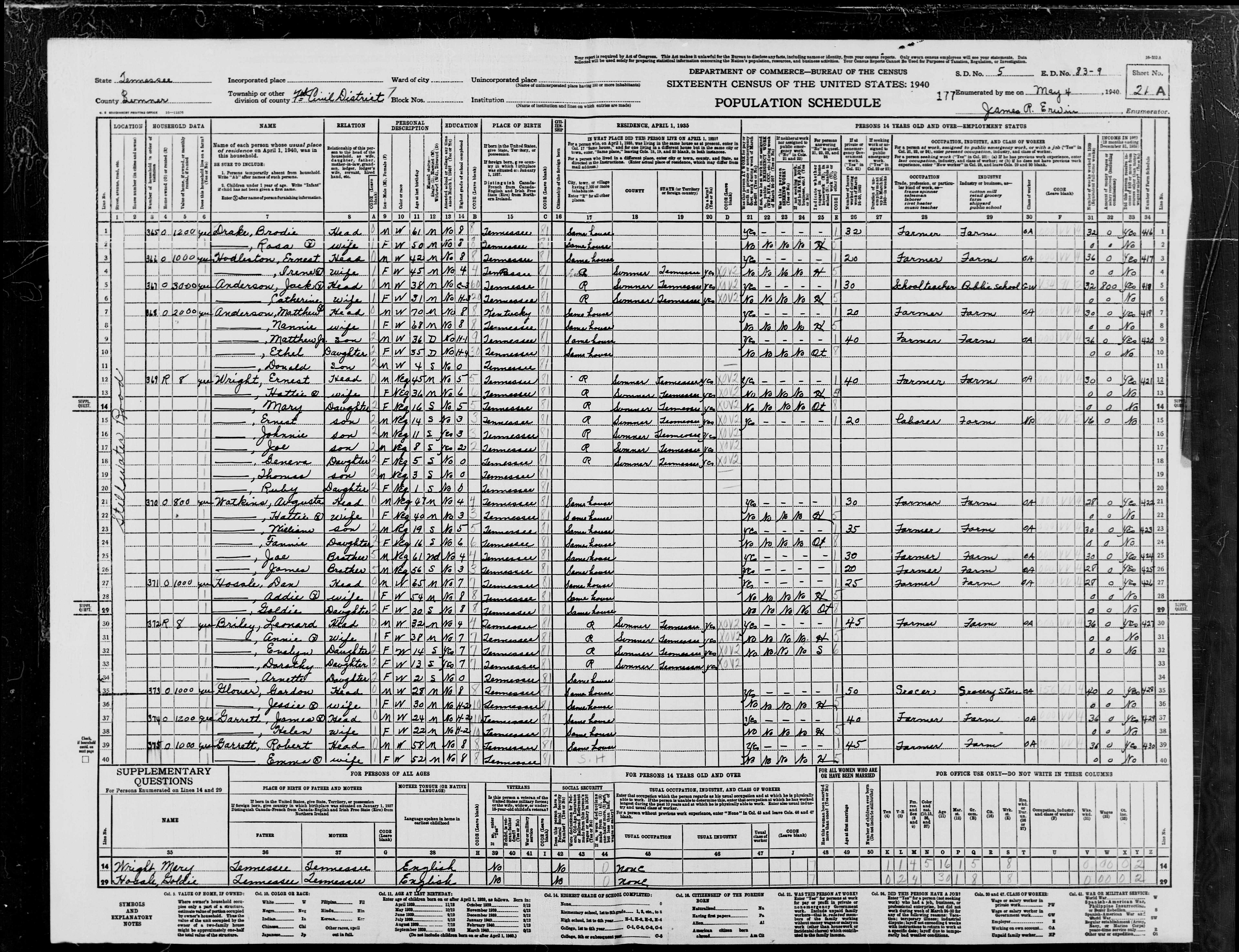 9325. “United States Census,” 1940, TN, Sumner County, District 7, 21A, 5, 83-9, T627, 5461381, 372, Bureau of the Census, US Dept. of Commerce, United States of America, May 4, 1940, James R Erwin, Names her as Evelyn Briley.
