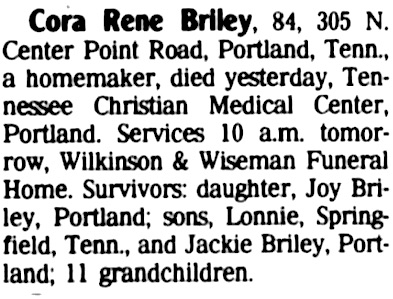 9304. “Obituaries,” Cora Rene Briley, The Tennessean, Nashville, TN, July 22, 1994, 13.