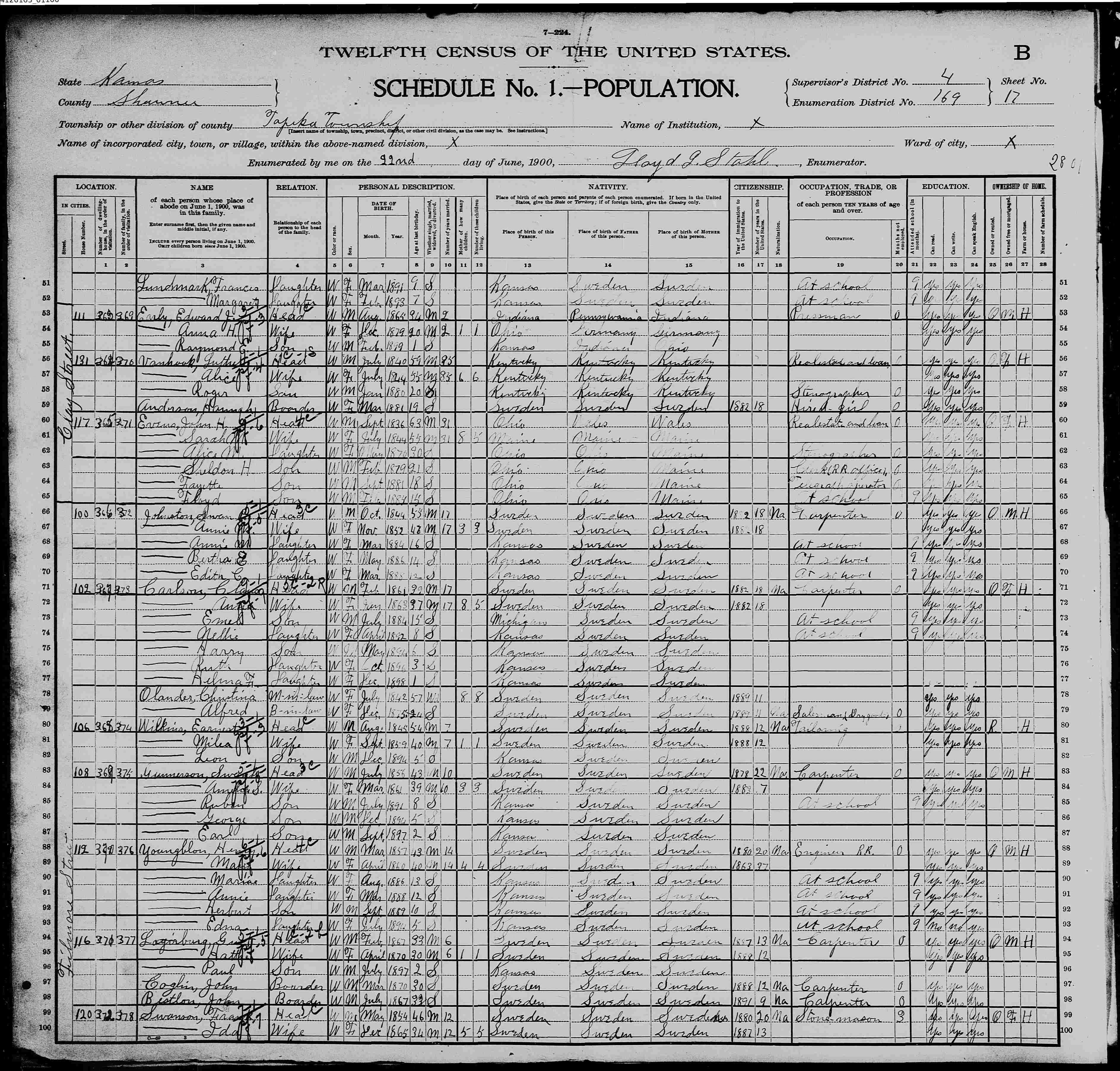 9420. “United States Census,” 1900, KS, Shawnee, Topeka, 17B, 4, 169, T623, 1240500, 2801, 1100, Bureau of the Census, US Dept. of Commerce, United States of America, June 22, 1900, Floyd G Stahl.
