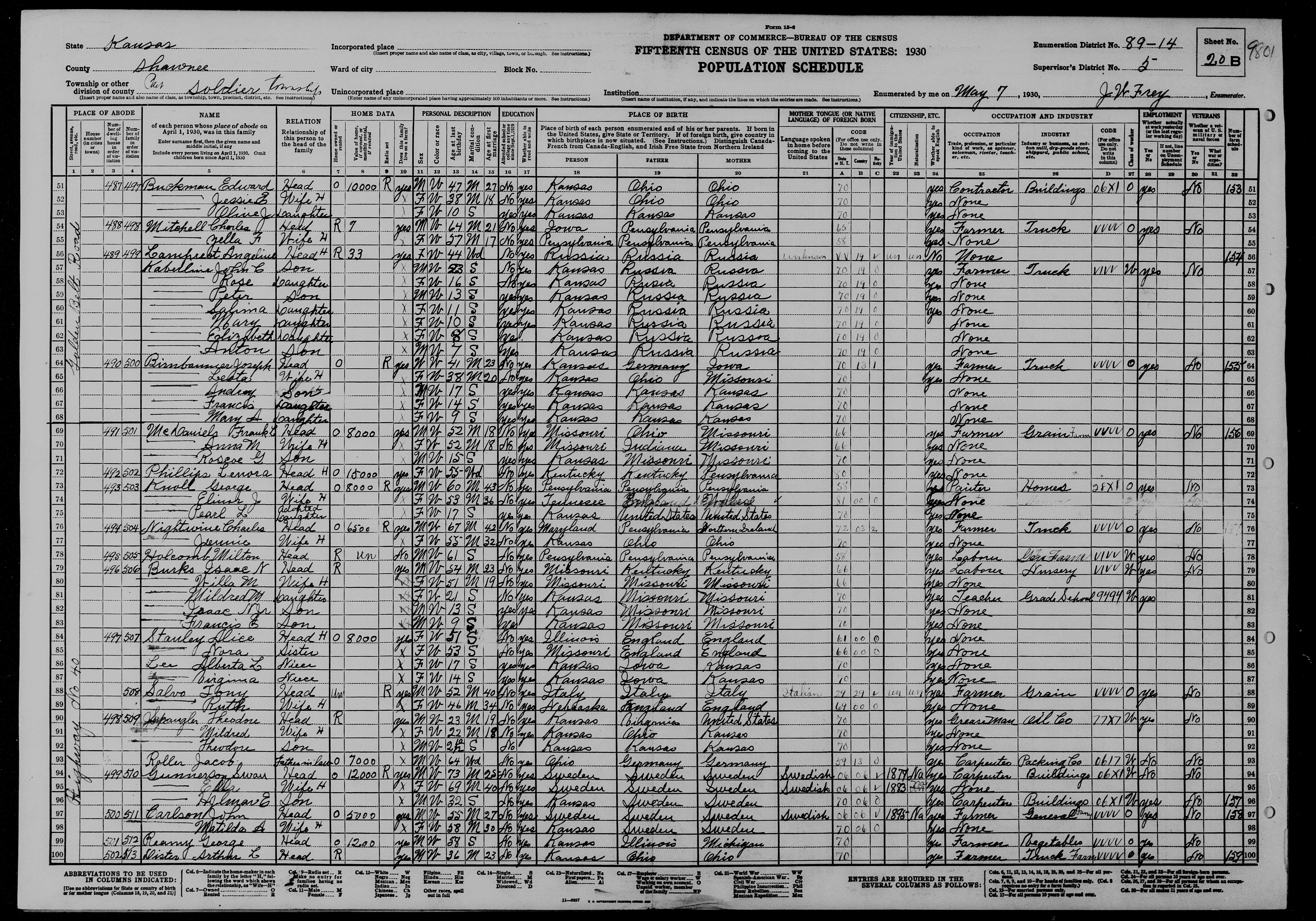 9421. “United States Census,” 1930, KS, Shawnee, Soldier, 20B, 5, 89-14, T626, 2340457, 247, Bureau of the Census, US Dept. of Commerce, United States of America, May 7, 1930, J W Frey.