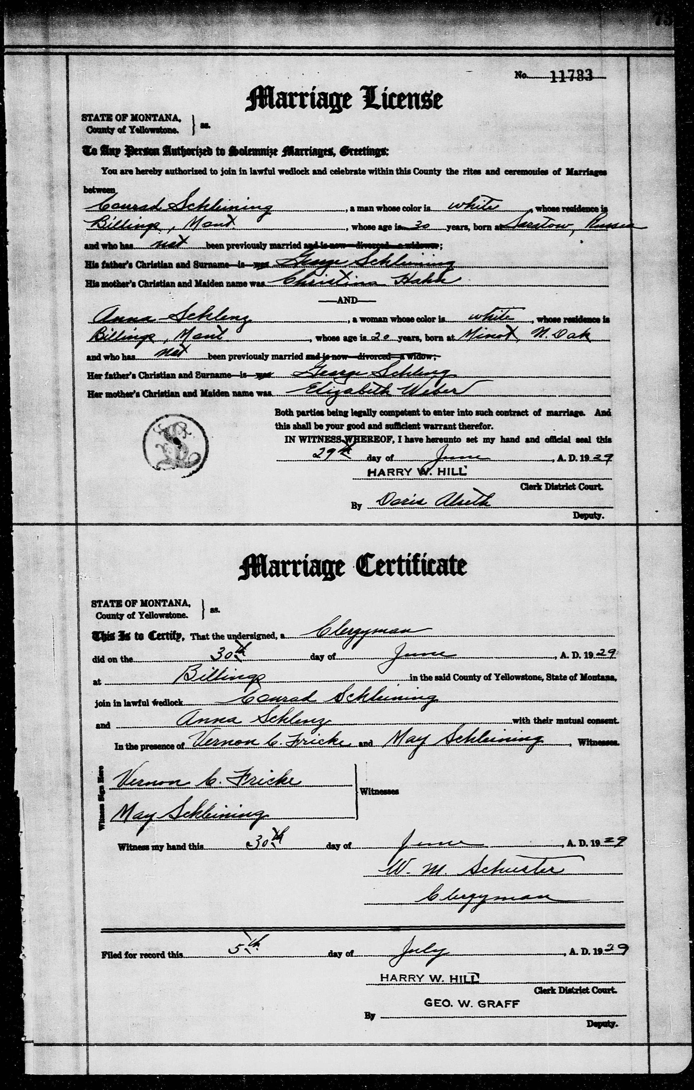 9806. Conrad Schleining and Anna Schlenz, “Montana, County Marriages, 1865-1950,” June 30, 1929, Billings, Yellowstone County, MT, https://www.familysearch.org/ark:/61903/1:1:F3QL-JQS.