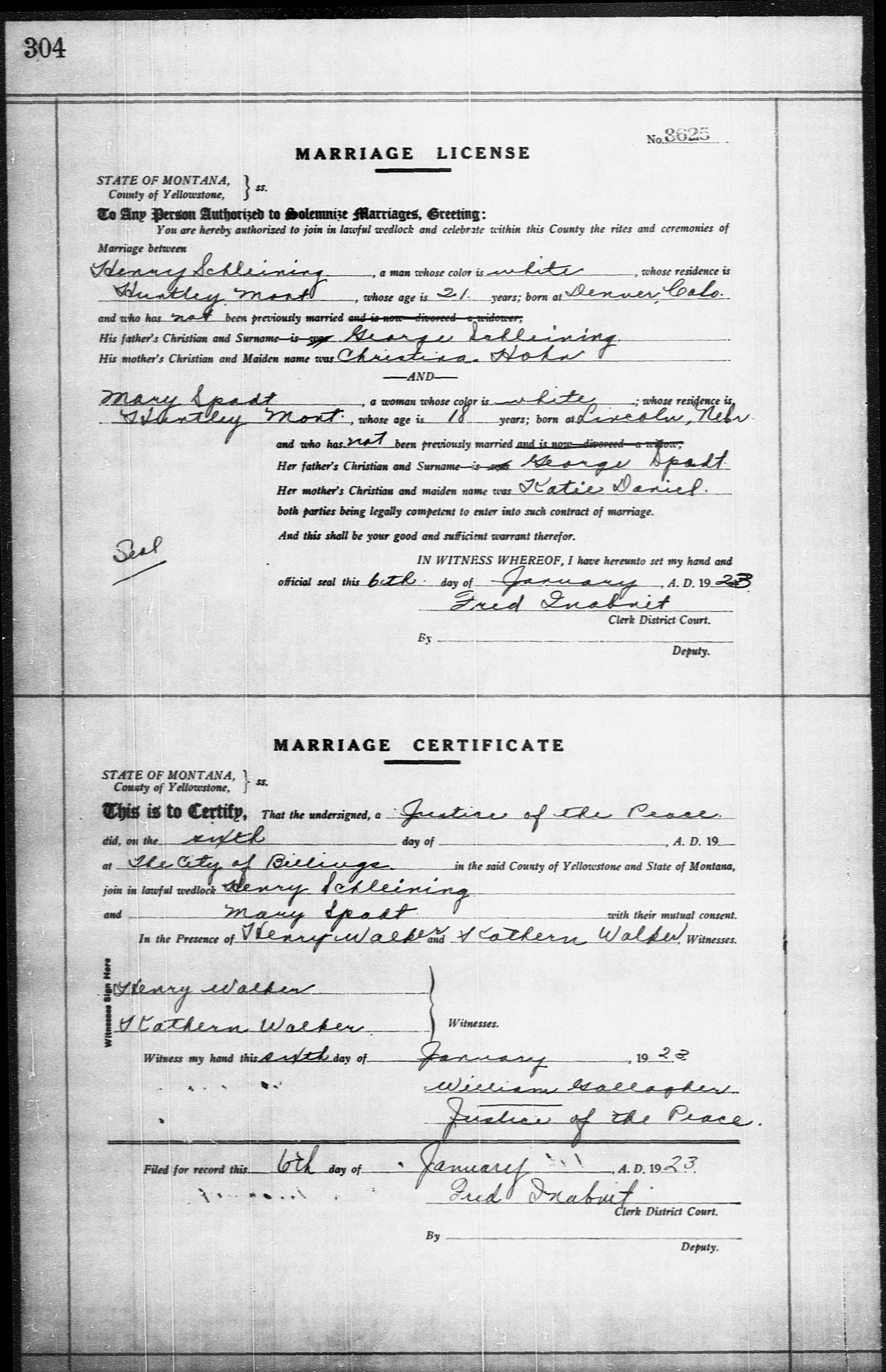 9807. Henry Schleining and Mary Spadt, “Montana, County Marriages, 1865-1950,” January 6, 1923, Billings, Yellowstone County, MT, https://www.familysearch.org/ark:/61903/1:1:F3QK-WLV.