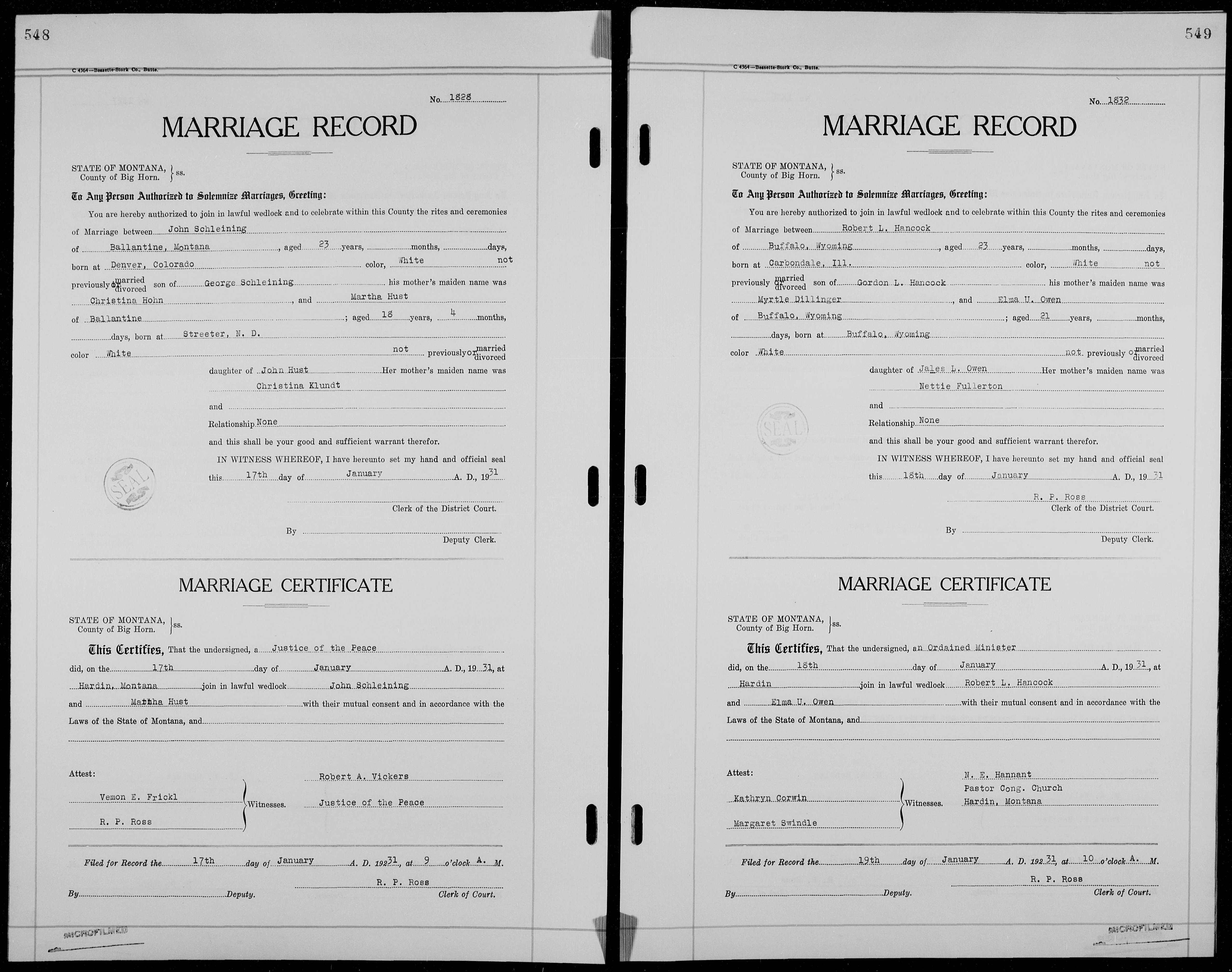 9808. John Schleining and Martha Hust, “Montana, County Marriages, 1865-1950,” January 17, 1931, Hardin, Big Horn County, MT, https://www.familysearch.org/ark:/61903/1:1:F3QH-HXM.