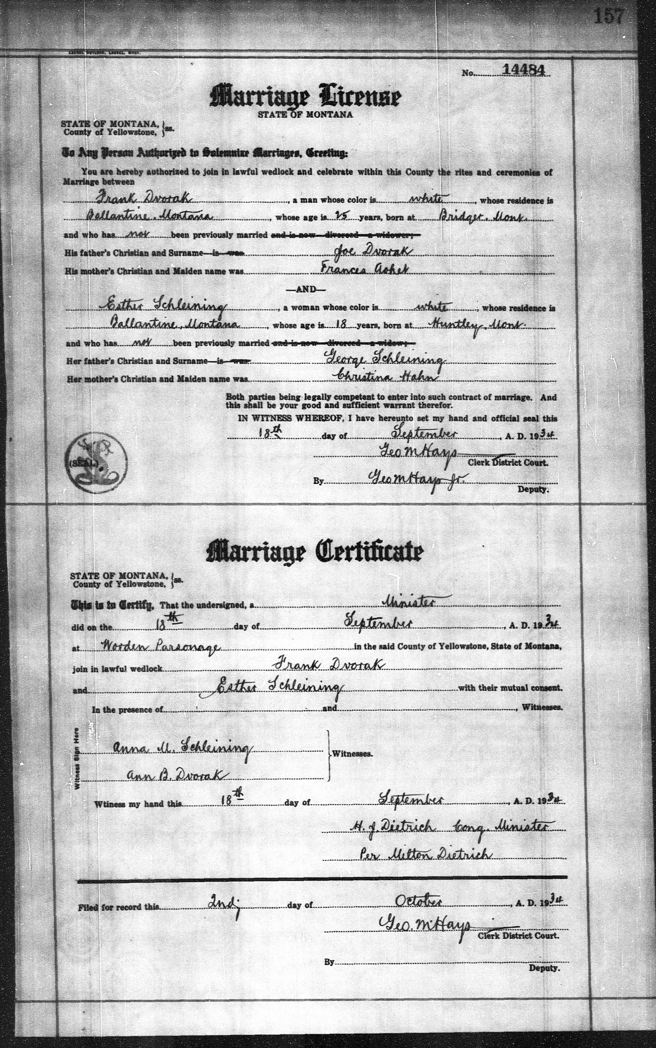 9815. Frank Dvorak and Esther Schleining, “Montana, County Marriages, 1865-1950,” September 18, 1934, Worden, Yellowstone County, MT, https://www.familysearch.org/ark:/61903/1:1:F3WS-3C1.