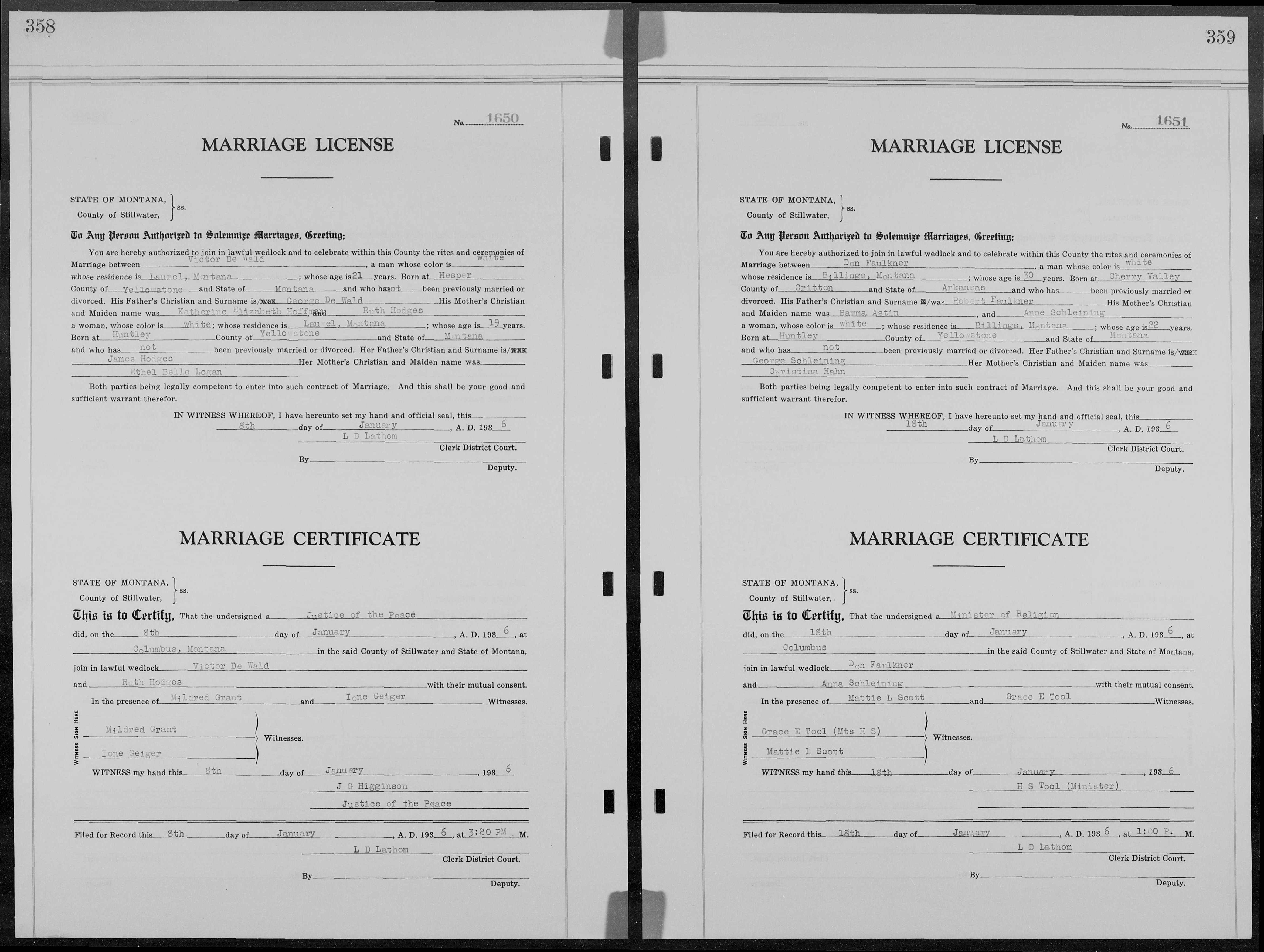 9816. Don Faulkner and Anne Schleining, “Montana, County Marriages, 1865-1950,” January 18, 1936, Columbus, Stillwater County, MT, https://www.familysearch.org/ark:/61903/1:1:F3WD-VJJ.