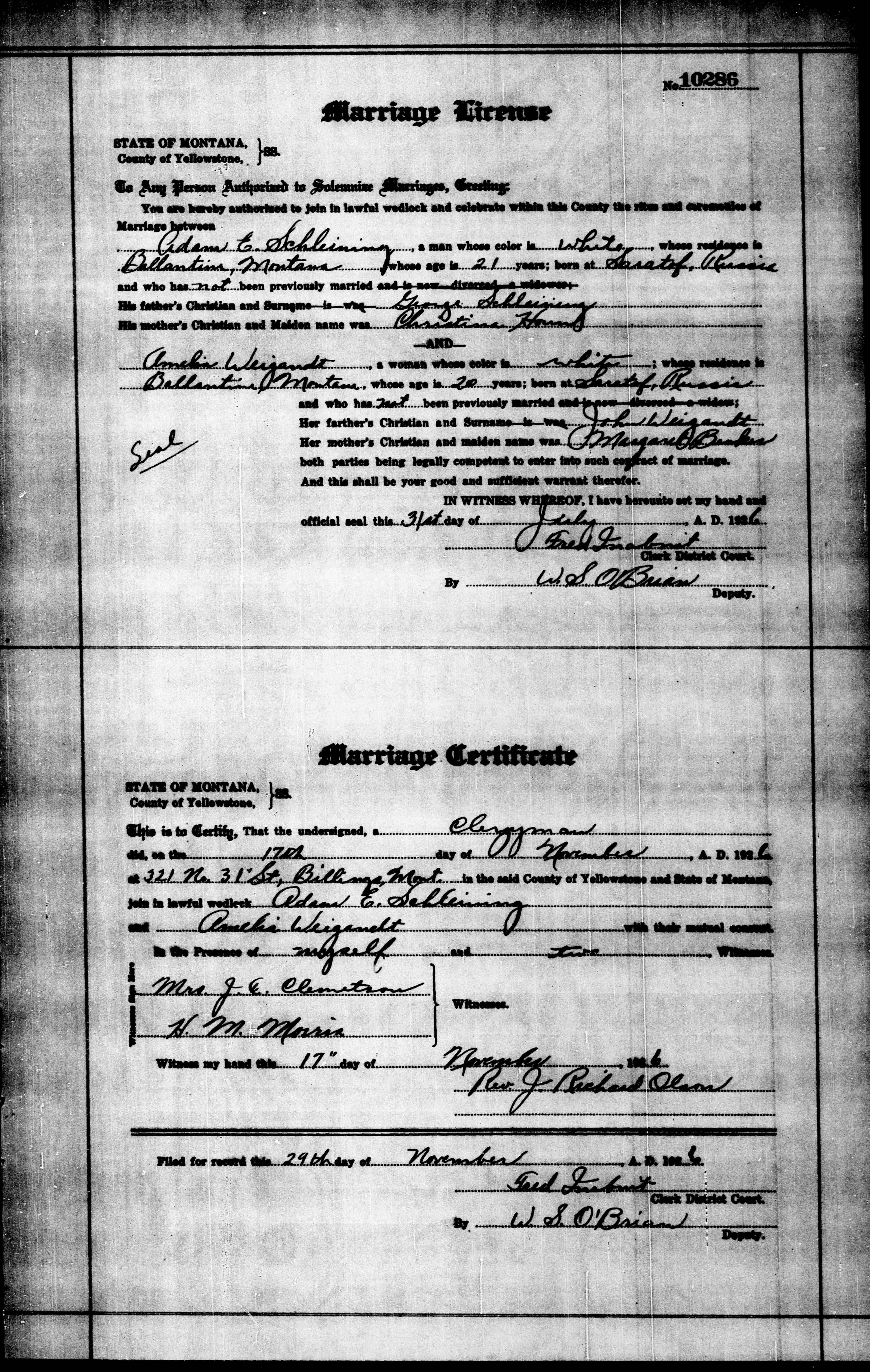 9819. Adam E Schleining and Amelia Weigandt, “Montana, County Marriages, 1865-1950,” November 17, 1926, Billings, Yellowstone County, MT, https://www.familysearch.org/ark:/61903/1:1:F3QG-4MF.