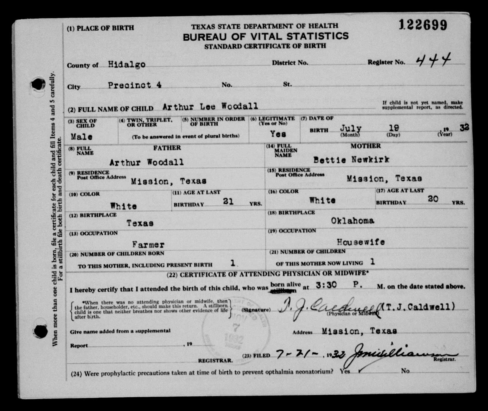 10154. Arthur Lee Woodall, “Texas Birth Certificates, 1903-1935,” July 19, 1932, Precinct 4, Hidalgo County, TX, https://www.familysearch.org/ark:/61903/1:1:K6GK-39N.