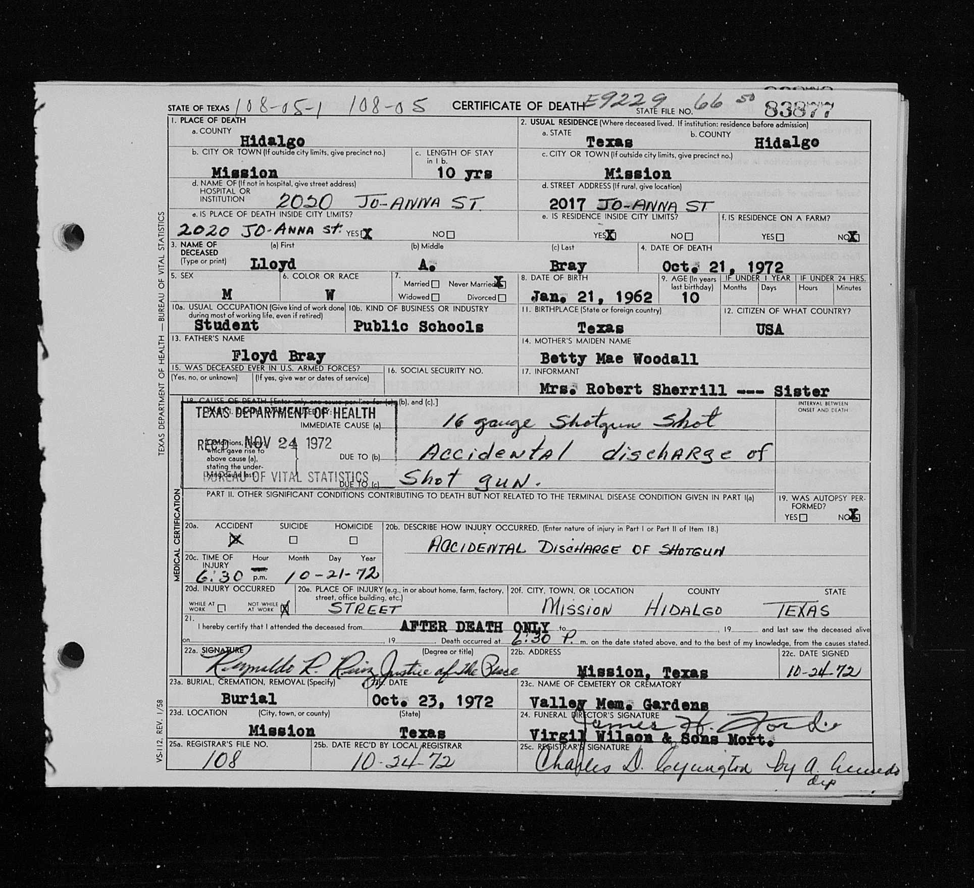 10160. Lloyd A Bray, “Texas Deaths, 1890-1976,” October 21, 1972, Mission, Hidalgo County, TX, https://www.familysearch.org/ark:/61903/1:1:K36L-5P5.