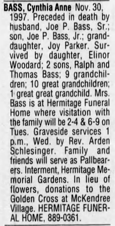 BASS, Cynthia Anne Nov. 30, 1997. Preceded in death by husband, Joe P. Bass, Sr.; son, Joe P. Bass, Jr.; granddaughter, Joy Parker. Survived by daughter, Elinor Woodard; 2 sons, Ralph and Thomas Bass; 9 grandchildren; 10 great grandchildren; 1 great great grandchild. Mrs. Bass is at Hermitage Funeral Home where visitation with the family will be 2-4 & 6-9 on Tues. Graveside services 1 p.m., Wed. by Rev. Arden Schlesinger. Family and friends will serve as Pallbearers. Interment, Hermitage Memorial Gardens. In lieu of flowers, donations to the Golden Cross at McKendree Village. HERMITAGE FUNERAL HOME, 889-0361.
