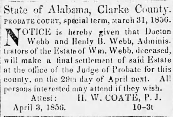 10166. “Notice of Administration,” Wm Webb, The Clarke County Democrat, Grove Hill, AL, April 3, 1856, 3.
