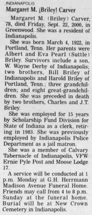 10178. “Obituaries,” Margaret M. Briley Carver, The Daily Journal, Franklin, IN, September 23, 2000, 5.