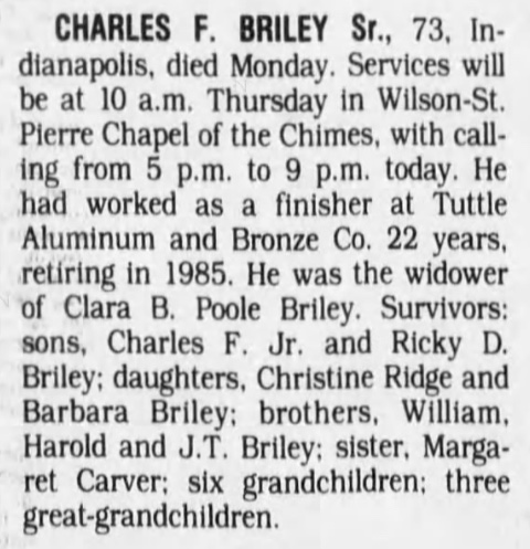 10181. “Obituaries,” Charles F. Briley, Sr., The Indianapolis Star, Indianapolis, IN, March 3, 1993, 10.