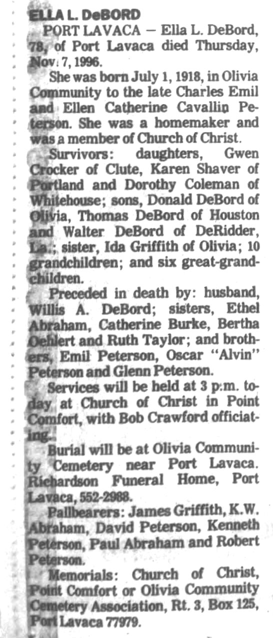 PORT LAVACA — Ella L. DeBord, 78, of Port Lavaca died Thursday, Nov. 7,1996. She was born July 1, 1918, in Olivia Community to the late Charles Emil and Ellen Catherine Cavallin Peterson. She was a homemaker and was a member of Church of Christ.