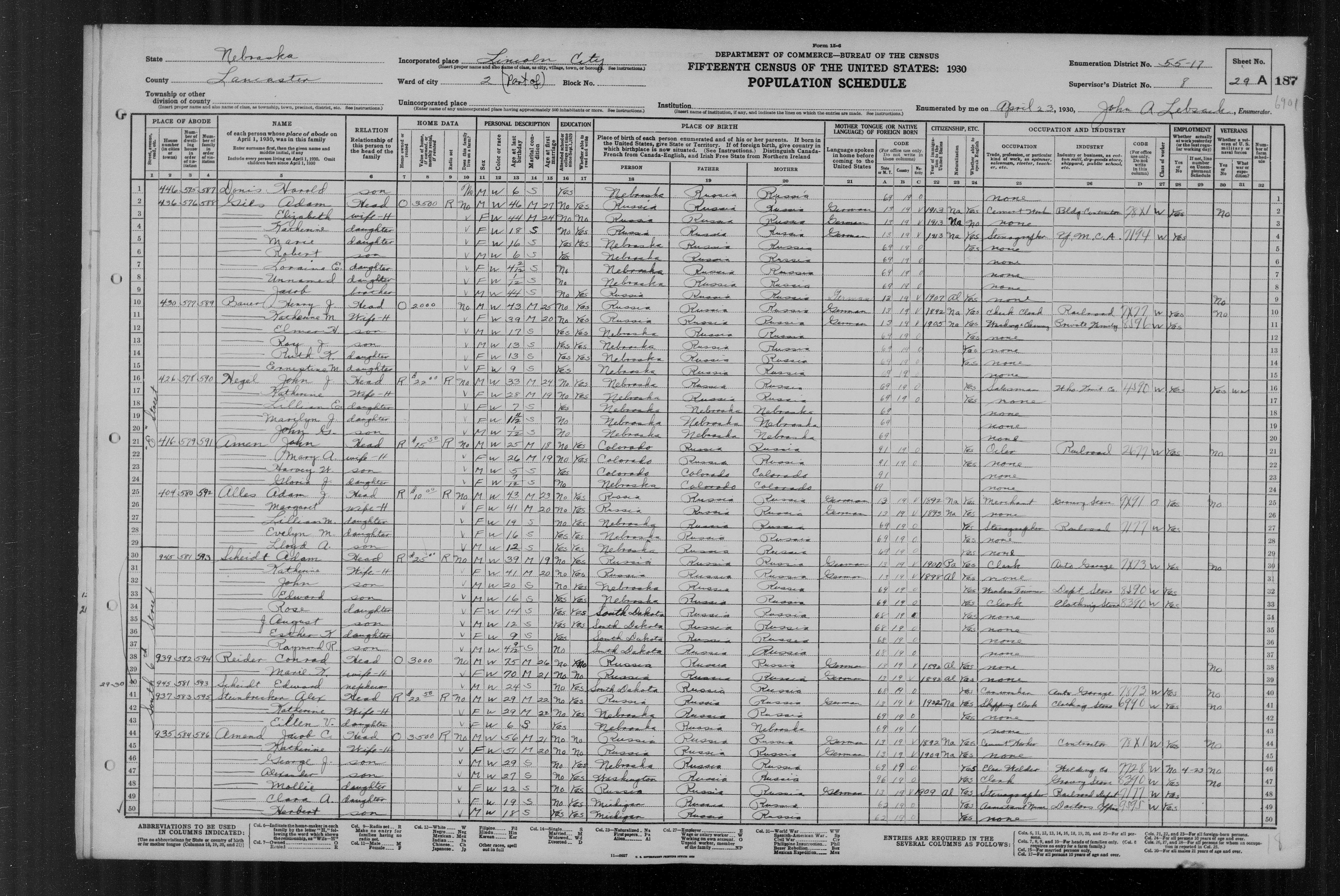 10280. “United States Census,” 1930, NE, Lancaster, Lincoln, Ward 2, 29A-29B, 8, 55-17, T626, 2341020, 187, 379, Bureau of the Census, US Dept. of Commerce, United States of America, April 23, 1930, John A Lebsack, Says born in Nebraska.