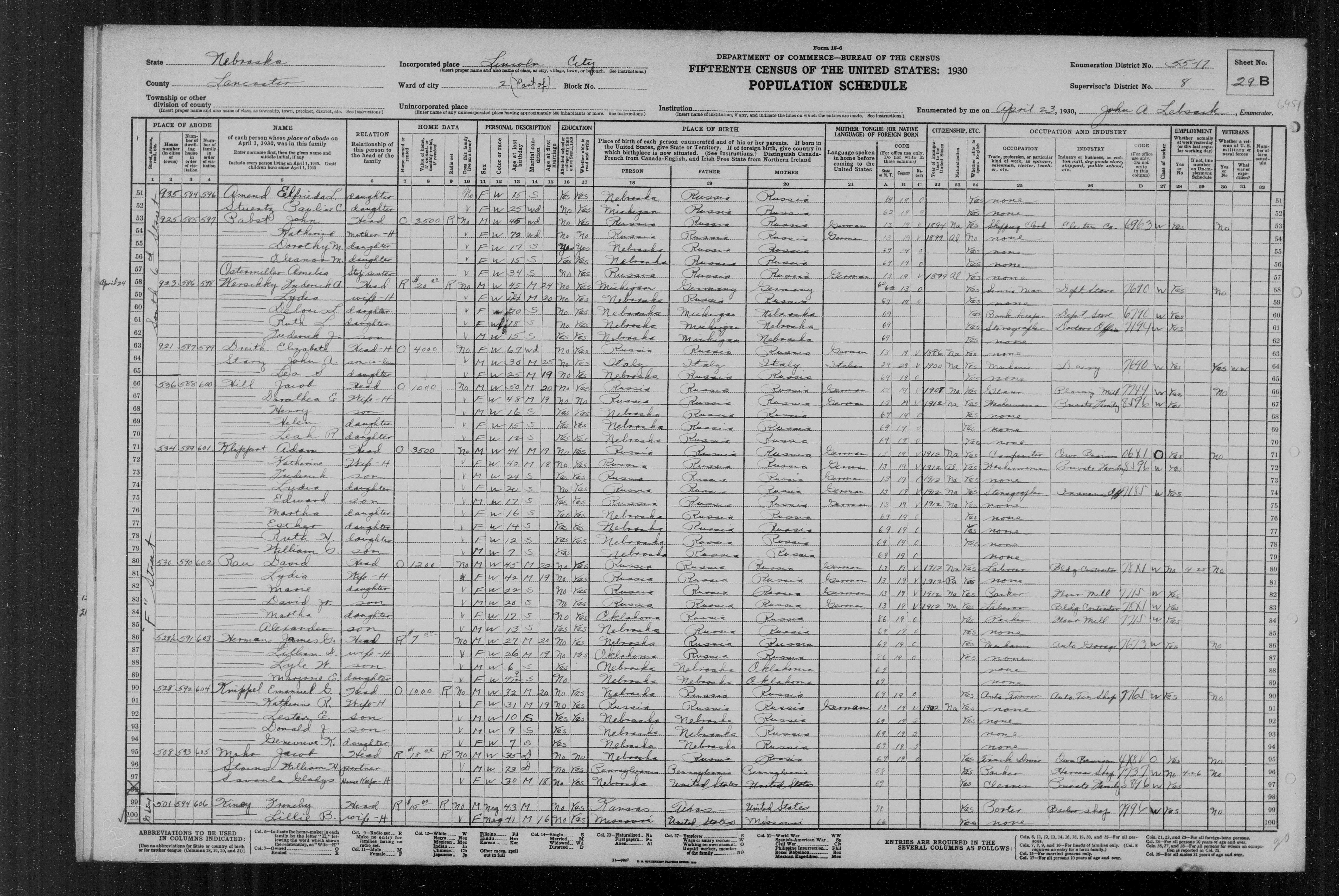 10274. “United States Census,” 1930, NE, Lancaster, Lincoln, Ward 2, 29A-29B, 8, 55-17, T626, 2341020, 187, 379, Bureau of the Census, US Dept. of Commerce, United States of America, April 23, 1930, John A Lebsack.