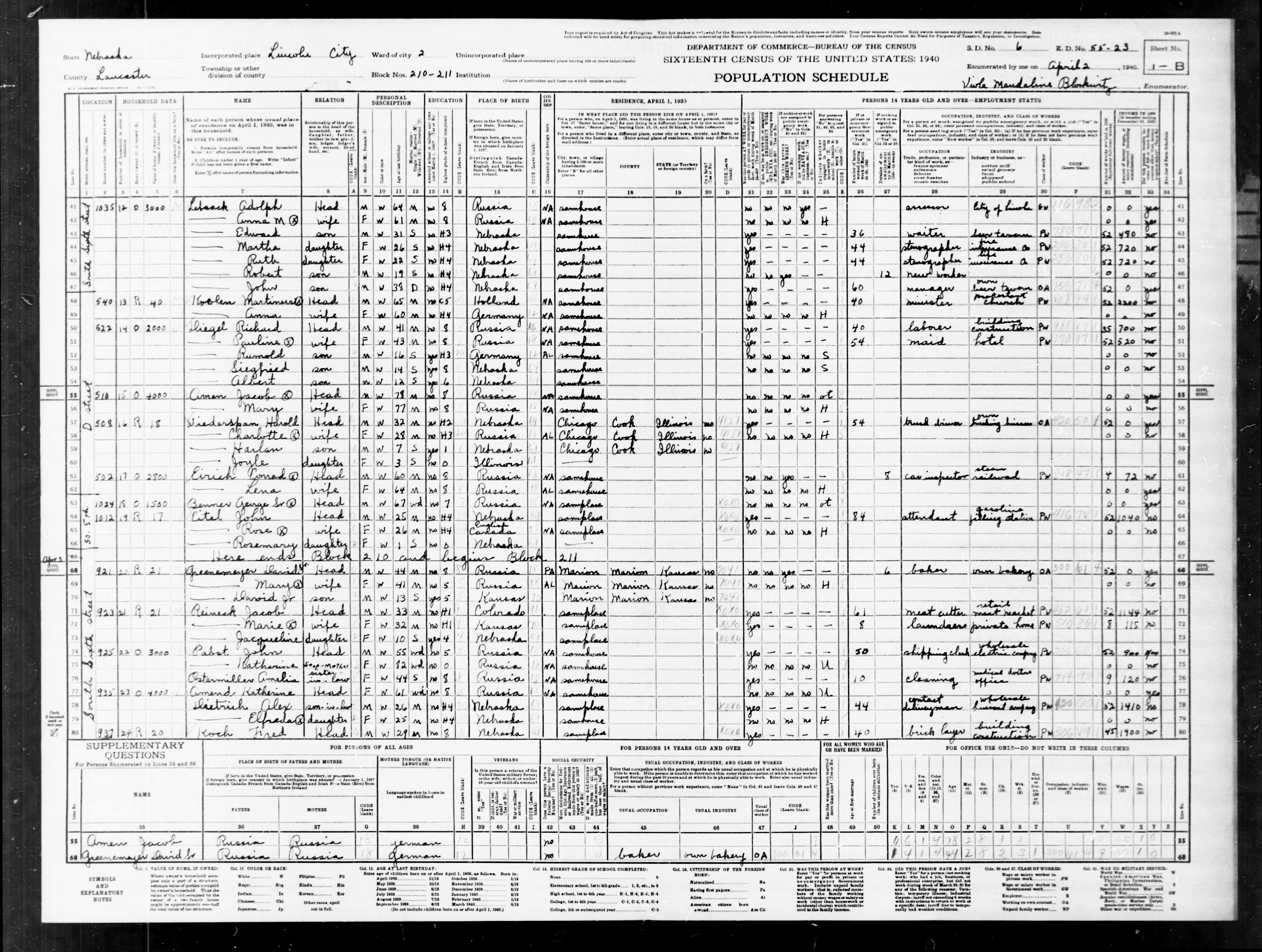 10275. “United States Census,” 1940, NE, Lancaster, Lincoln, Ward 2, 1B, 6, 55-23, T627, 5460559, 470, Bureau of the Census, US Dept. of Commerce, United States of America, April 2, 1940, Viola Maudaline Blockurtz.