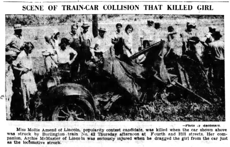 10278. “SCENE OF TRAIN-CAR COLLISION THAT KILLED GIRL,” Mollie Amend, The LIncoln Evening Journal, Lincoln, NE, June 26, 1931, 12.