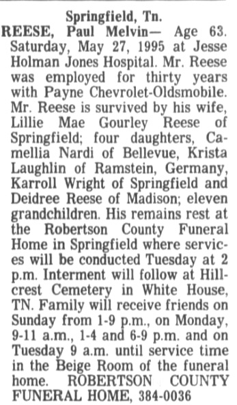 REESE, Paul Melvin— Age 63. Saturday, May 27, 1995 at Jesse Holman Jones Hospital. Mr. Reese was employed for thirty years with Payne Chevrolet-Oldsmobile. Mr. Reese is survived by his wife, Lillie Mae Gourley Reese of Springfield; four daughters, Camellia Nardi of Bellevue, Krista Laughlin of Ramstein, Germany, Karroll Wright of Springfield and Deidree Reese of Madison; eleven grandchildren. His remains rest at the Robertson County Funeral Home in Springfield where services will be conducted Tuesday at 2 p.m. Interment will follow at Hillcrest Cemetery in White House, TN. Family will receive friends on Sunday from 1-9 p.m, on Monday, 9-11 a.m, 1-4 and 6-9 p.m. and on Tuesday 9 a.m. until service time in the Beige Room of the funeral home. ROBERTSON COUNTY FUNERAL HOME, 384-0036