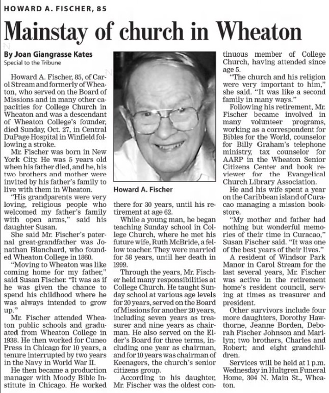 10308. “Obituaries,” Howard A Fischer, Chicago Tribune, Chicago, IL, October 30, 2002, D2-9.