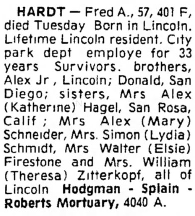 10336. “Deaths and Funerals,” Fred A Hardt, Lincoln Journal Star, Lincoln, NE, February 25, 1976, 35.